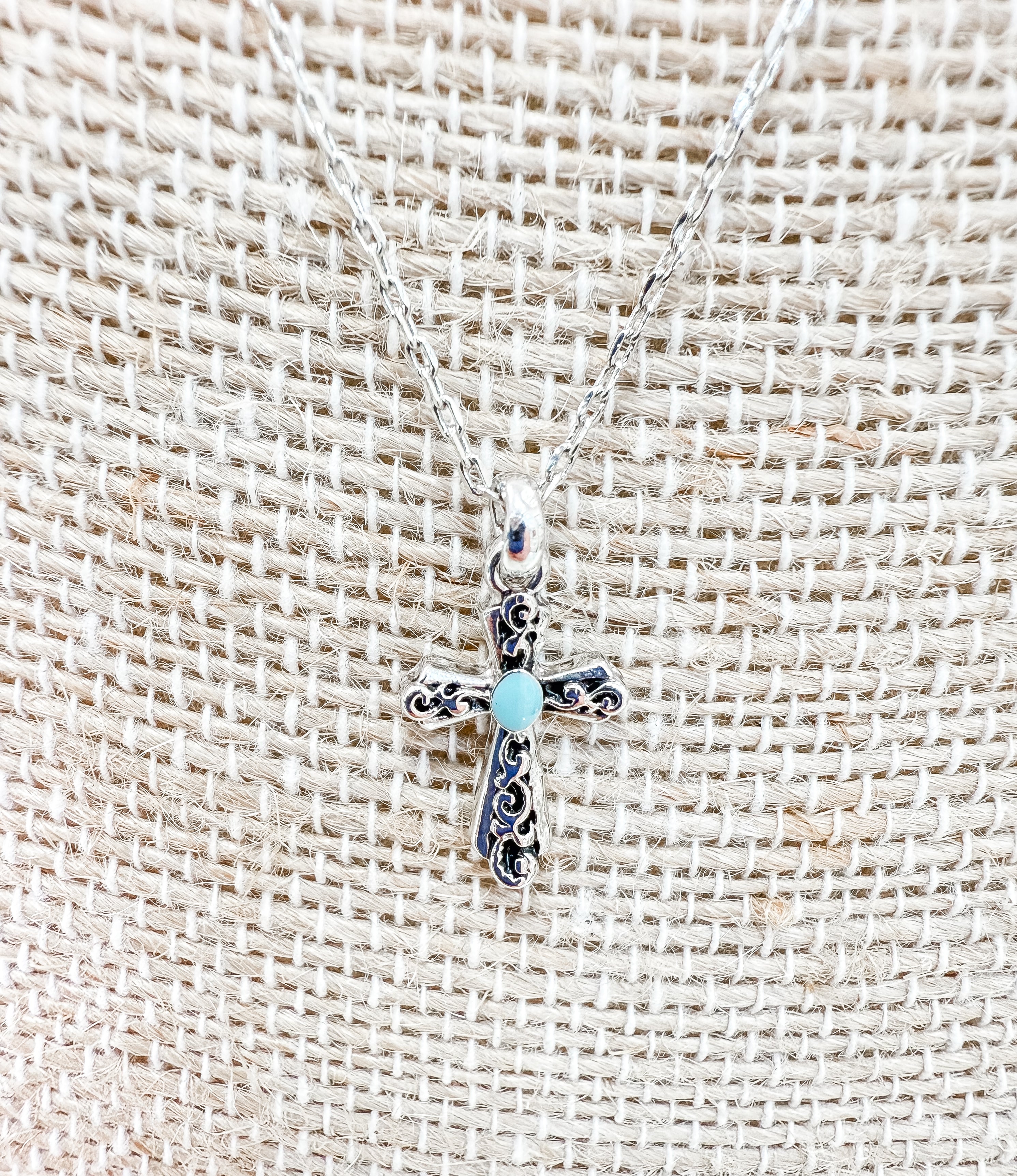 Add some divine style to your look with our Soul Radiance Cross Necklace. This unique necklace features a radiant textured cross design and a small aqua stone that will surely bring a touch of spiritual energy to any outfit. Perfect for casual or formal wear. Let your soul shine and this gorgeous sterling silver necklace!