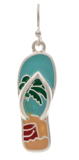 Step into summer with this adorable flip flop earring, featuring a coastal scene right on the sole! Set in a silver-tone frame, this fun design showcases a turquoise sky, palm tree, sandy shore, and a beachy red-striped towel—all captured in vibrant enamel detail. A playful nod to sunshine and seaside days!