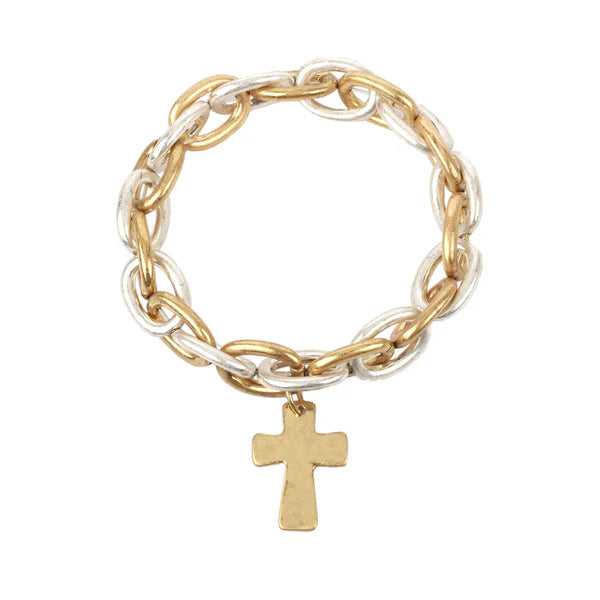 Worn Gold and Silver Linked Stretch Bracelet with Cross
