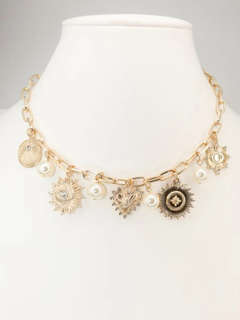 Gold Chain Necklace with a Starburst, Heart and Pearl Charms