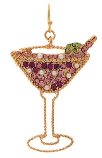 Sip in style with this glitzy martini glass earring—an instant conversation starter! Crafted with twisted gold-tone metal and filled with sparkling pink crystals, mini pearls, and a pop of green "garnish," this earring brings the party wherever you go. Whether you're headed to brunch or a girls' night out, this playful piece adds a splash of fun to any outfit.