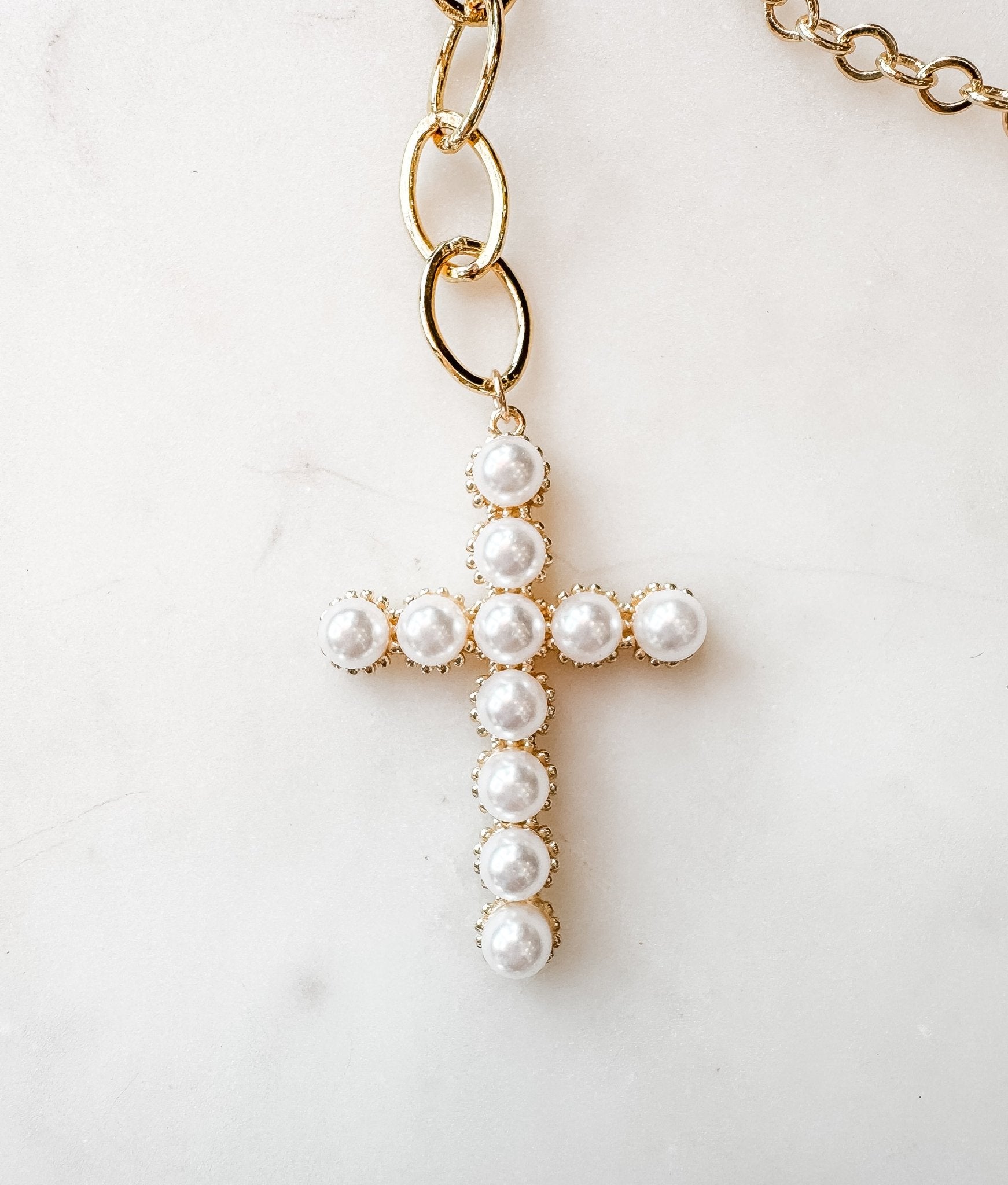 This necklace features a classic, elegant design with a gold-tone chain made of large interlocking links, giving it a bold and timeless look. The pendant is a cross adorned with delicate pearl accents, each pearl adding a soft luster that contrasts beautifully with the gold. The cross’s vertical and horizontal bars are symmetrically crafted, giving the piece a sense of harmony and balance. This necklace brings together the sophistication of pearls and the timeless appeal of a cross motif, making it both a statement of style and faith. Perfect for adding grace and elegance to any ensemble.