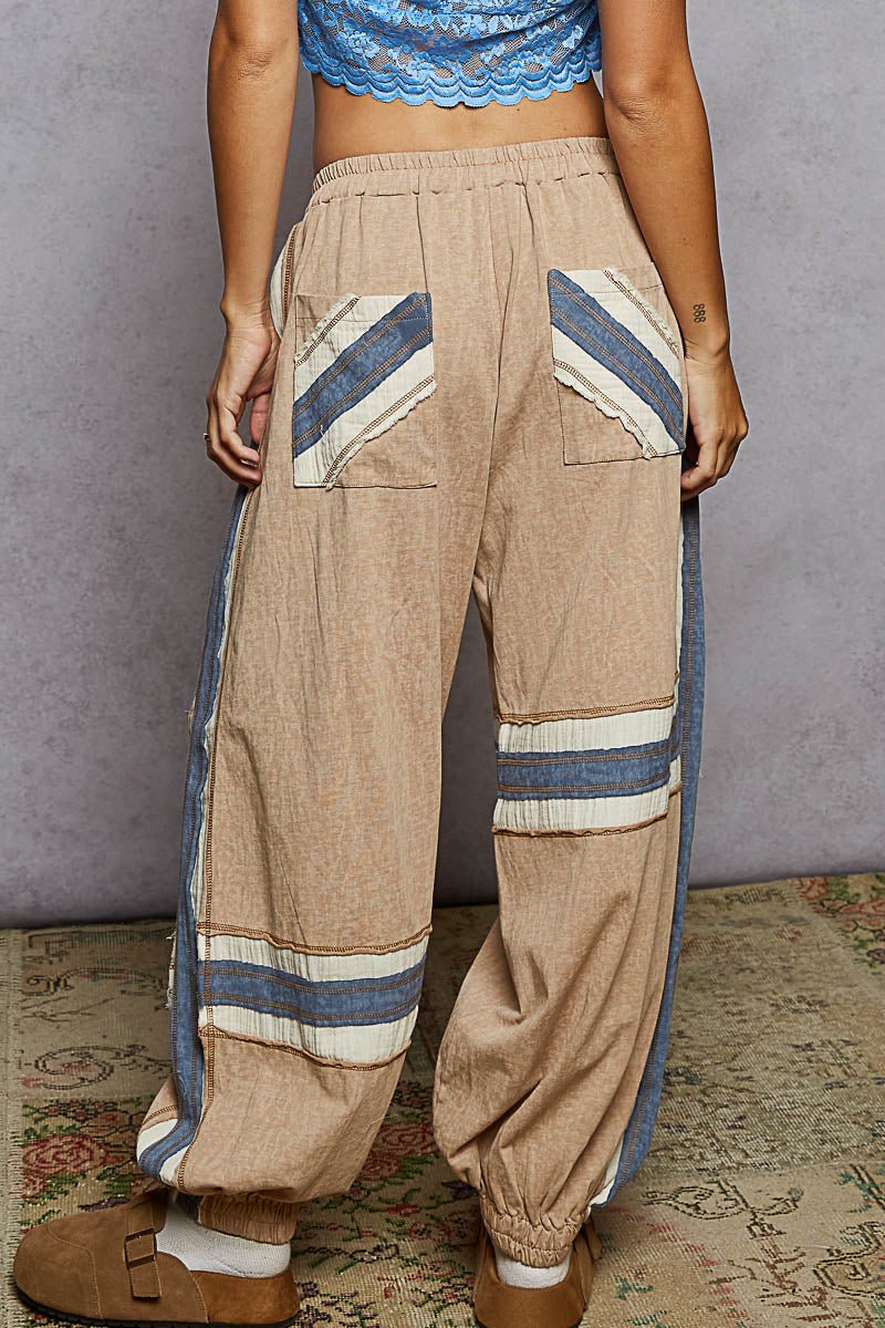Designed in jogger pants in cotton with double gauze patch, color blocked patch, overlock stitch point, outseam detail, waist loop with painting, vintage washing, solid color.