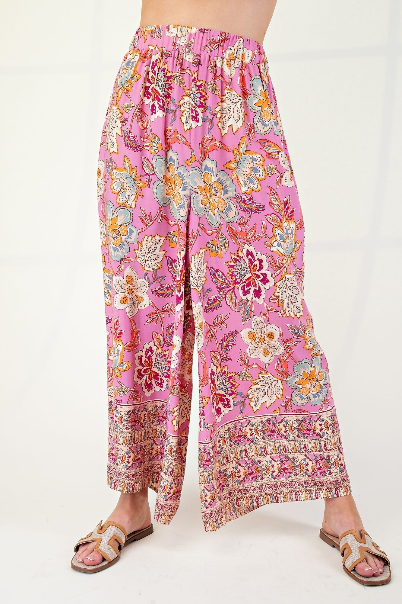 BORDER PRINTED RAYON CHALLIS ANKLE PANTS -ELASTIC WAISTBAND -SIDE POCKETS -WIDE LEG SILHOUETTE -FLORAL PRINT DESIGN WITH ACCENTED HEM -LIGHTWEIGHT AND FLOWY -RELAXED AND LOOSE FIT
