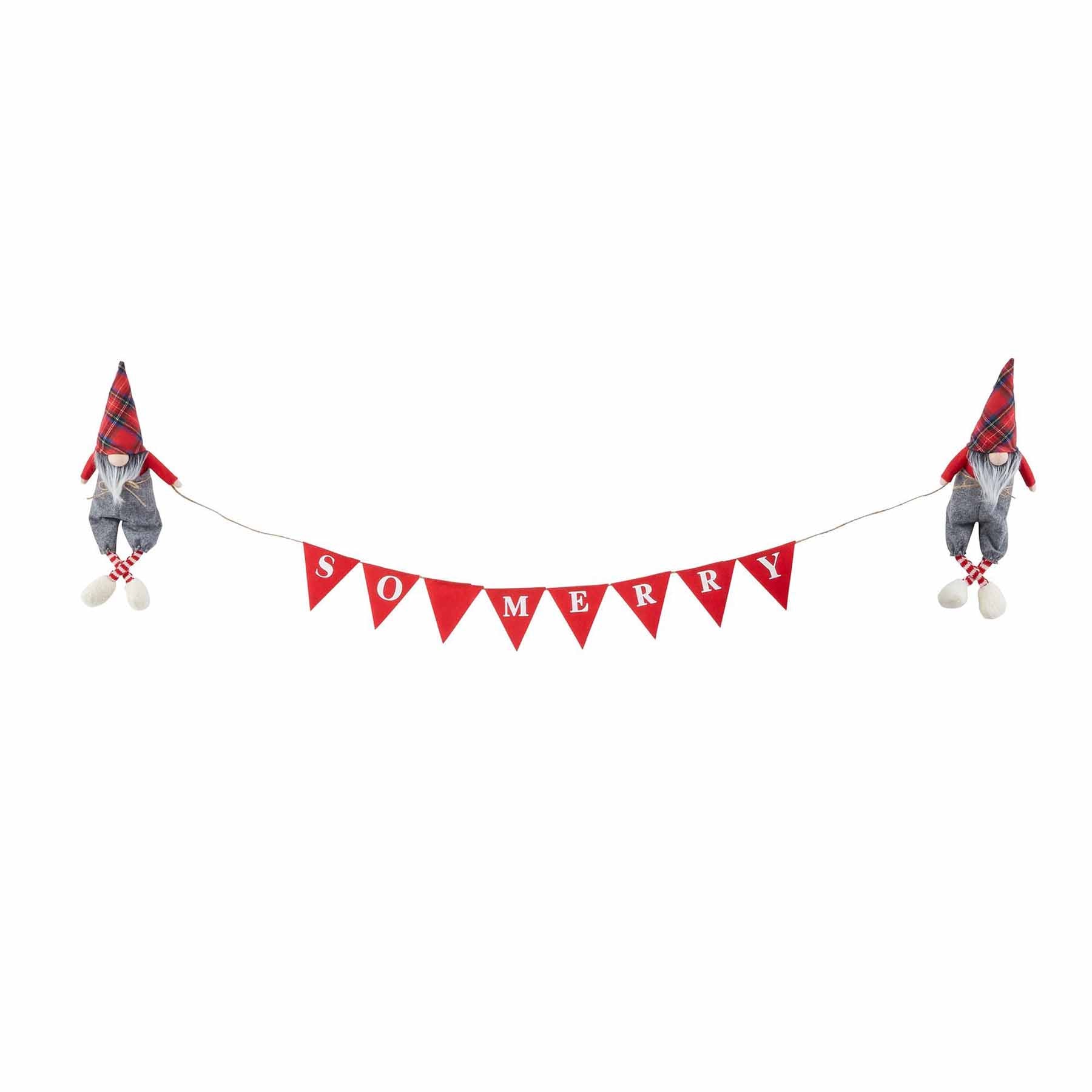 This Gnome Mantle banner has two tartan and felt dangle leg gnomes hold printed felt pennant banner.