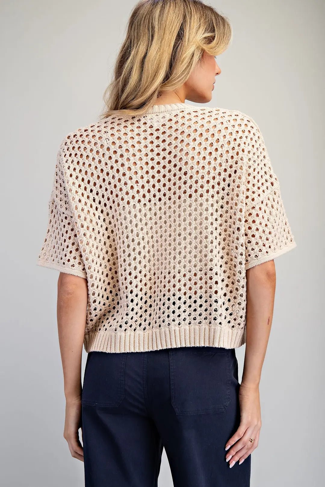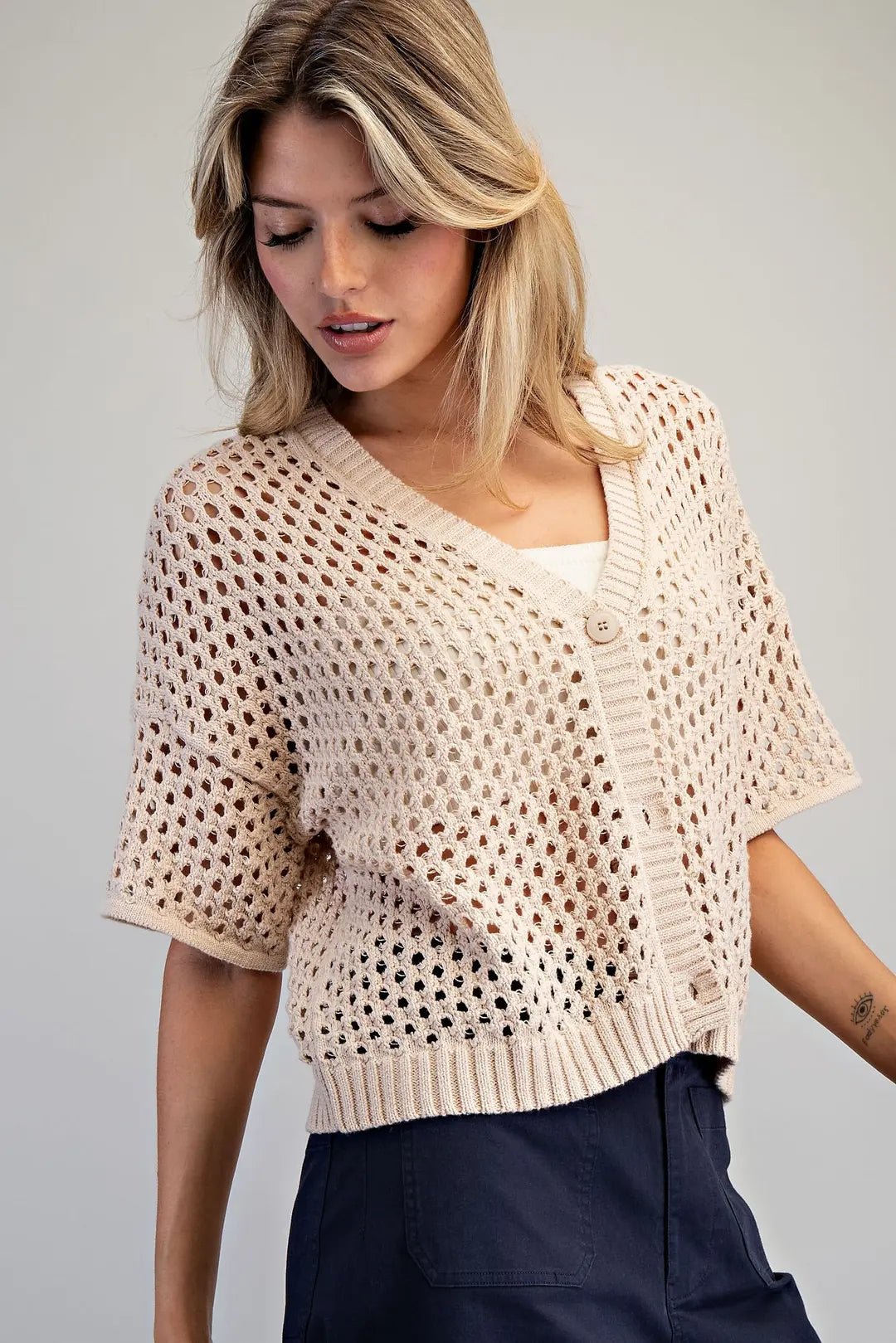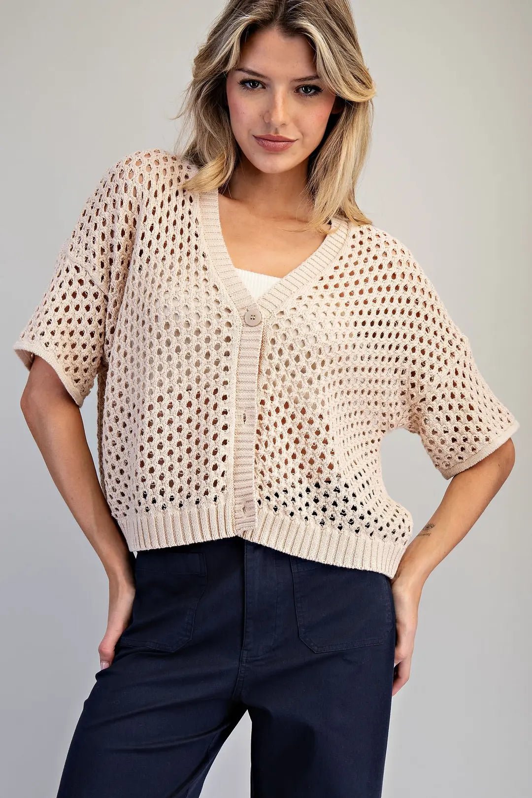 This open knit top features a breathable crochet style pattern with relaxed short sleeves, ribbed trim along the V-neckline and hem, and a full button down front closure for an airy, easygoing summer layer.