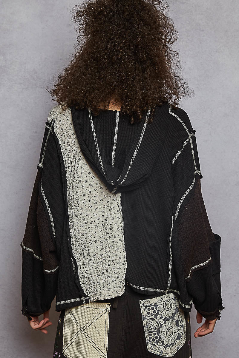 Designed in placket hoodie, balloon sleeve, semi cropped fit top in thermal and cut and sew knit mix with overlock stitch detail pointed floral pattern.