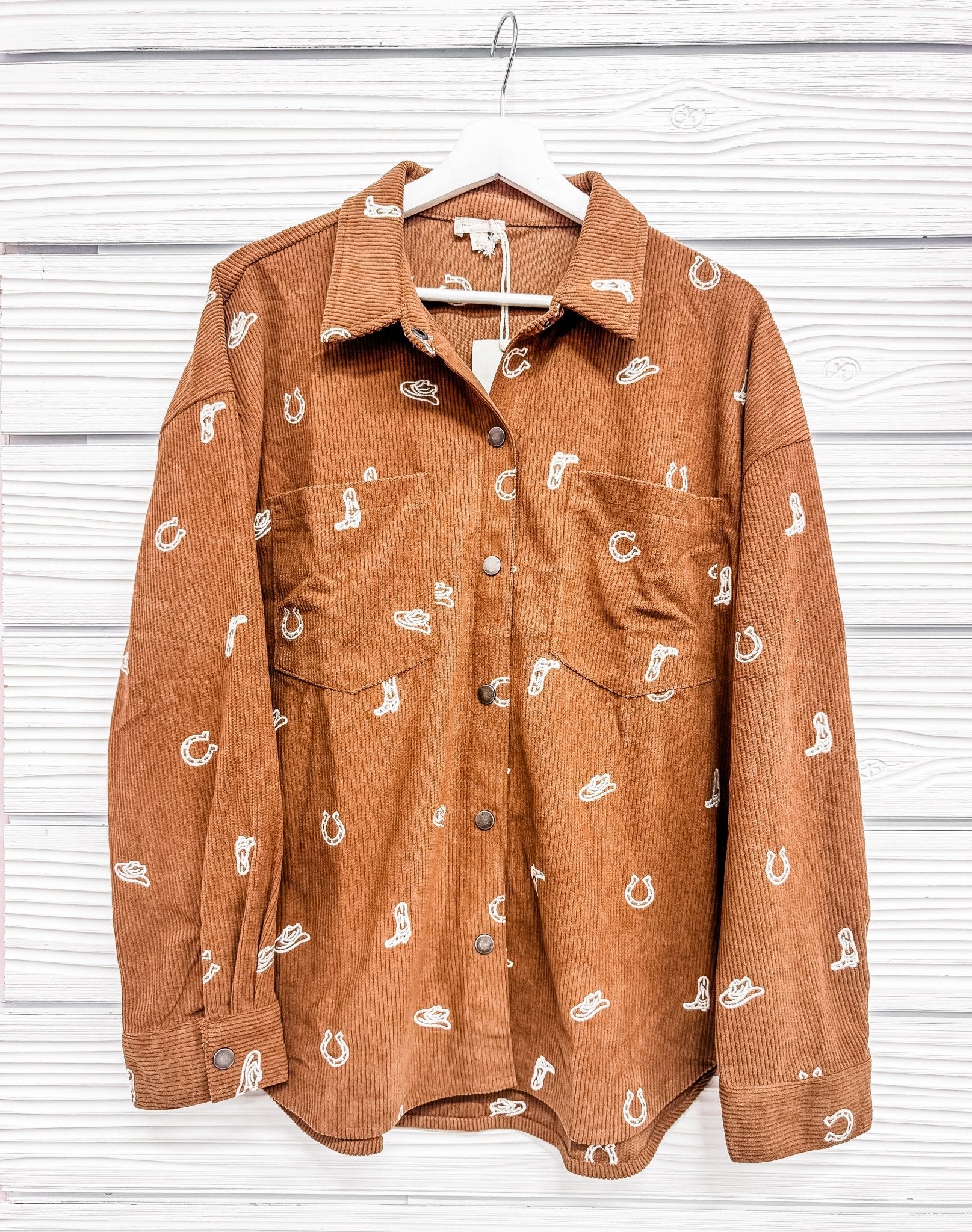 Get ready to turn heads with the We Mean It Jacket! This playful corduroy shirt features charming cowgirl embroidery that adds a fun, western flair to your everyday look. Perfect for layering, it combines cozy comfort with a bold attitude—because sometimes, your jacket should say it all before you do.