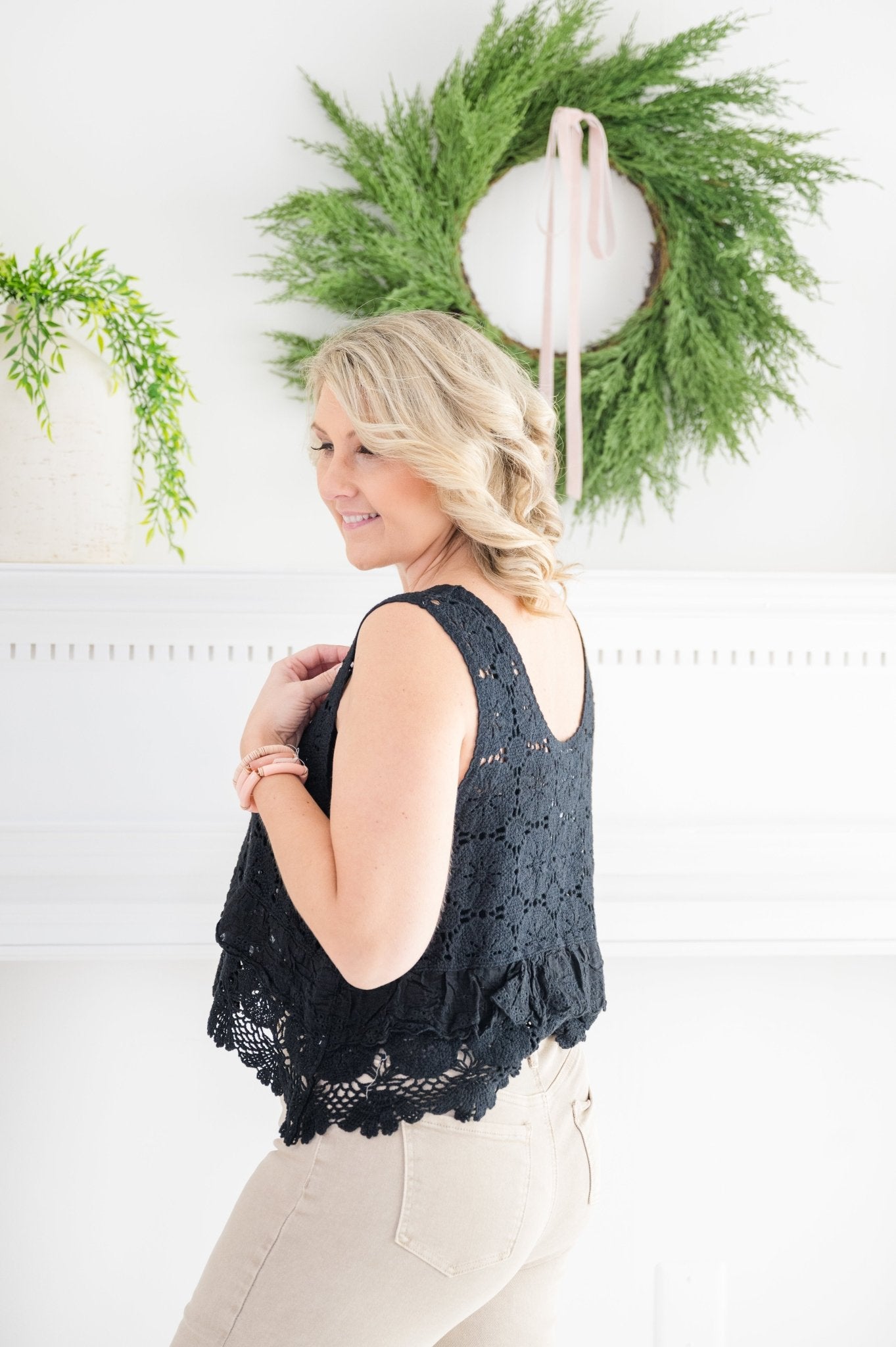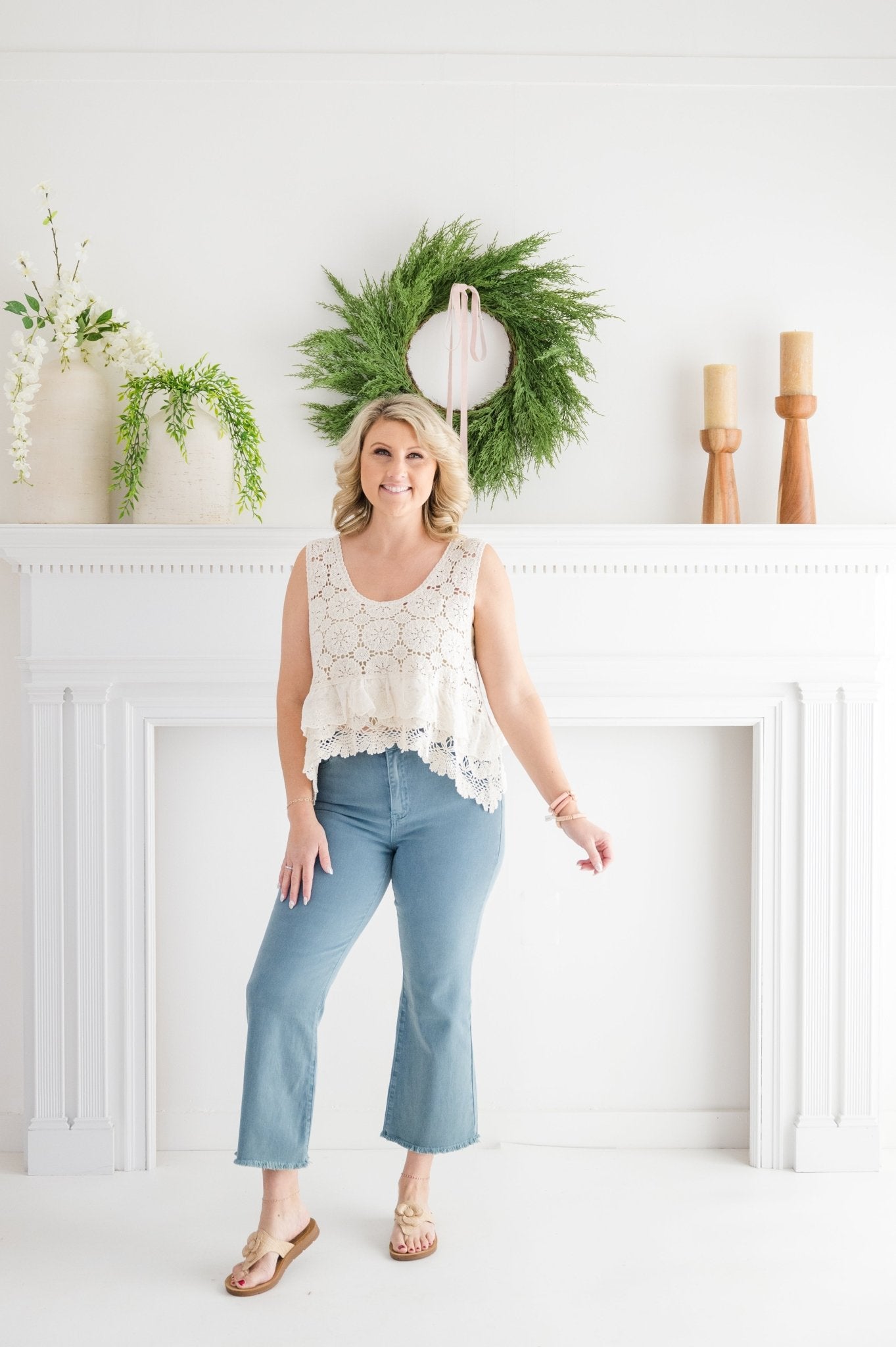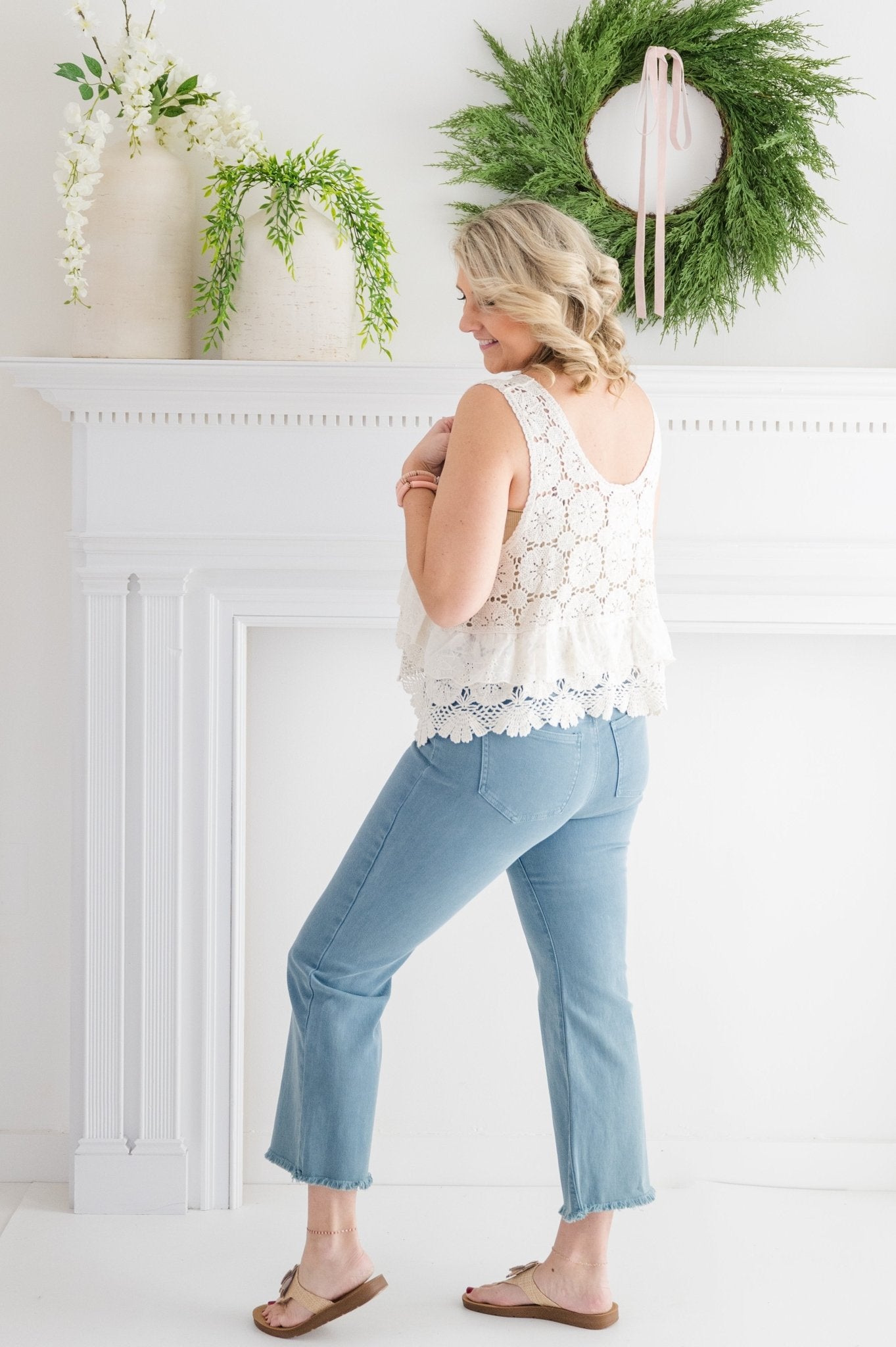 The Step Into A Dream Sleeveless Crochet Top is your new go-to for effortless style. This sleeveless beauty features a delicate, lightweight crochet knit that’s perfect for layering or wearing solo on sunny days. Its breezy design adds a playful touch to any outfit, making it easy to mix, match, and dream up endless looks.