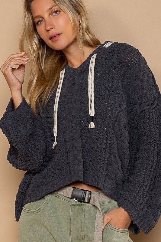 Designed in a V-neck hoodie with long sleeves.  Top has a roomy fit with chenille fabric.  This pullover sweater has a tie detail around the hood.
