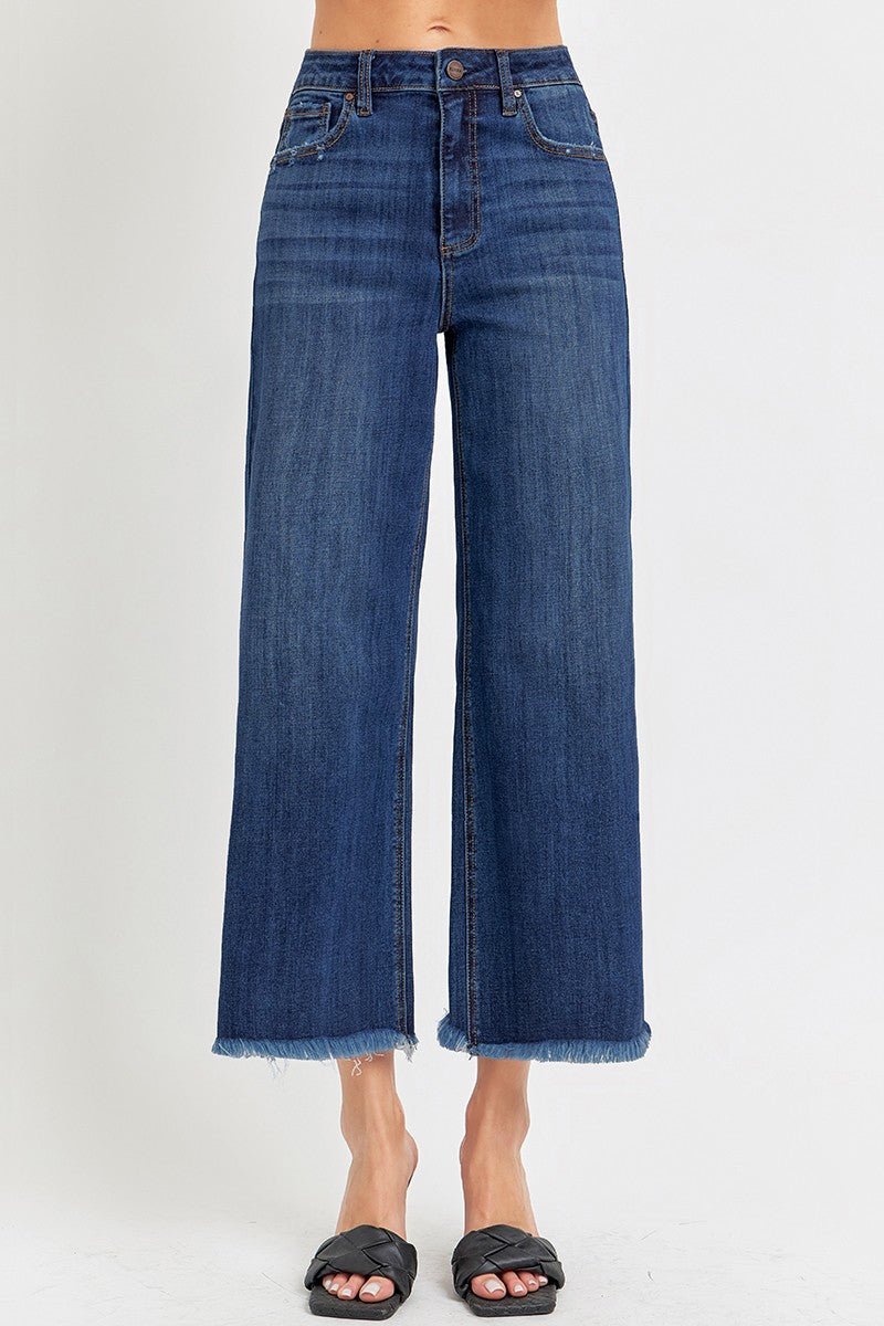 Expertly crafted with a high waistband and front zip button closure for a comfortable fit, the Risen Total Upgrade Wide Leg Crop Jeans offer a flattering silhouette. The wide leg bottom and raw hem line add a touch of style to the dark wash and stretchy material. Upgrade your denim collection with this must-have piece.