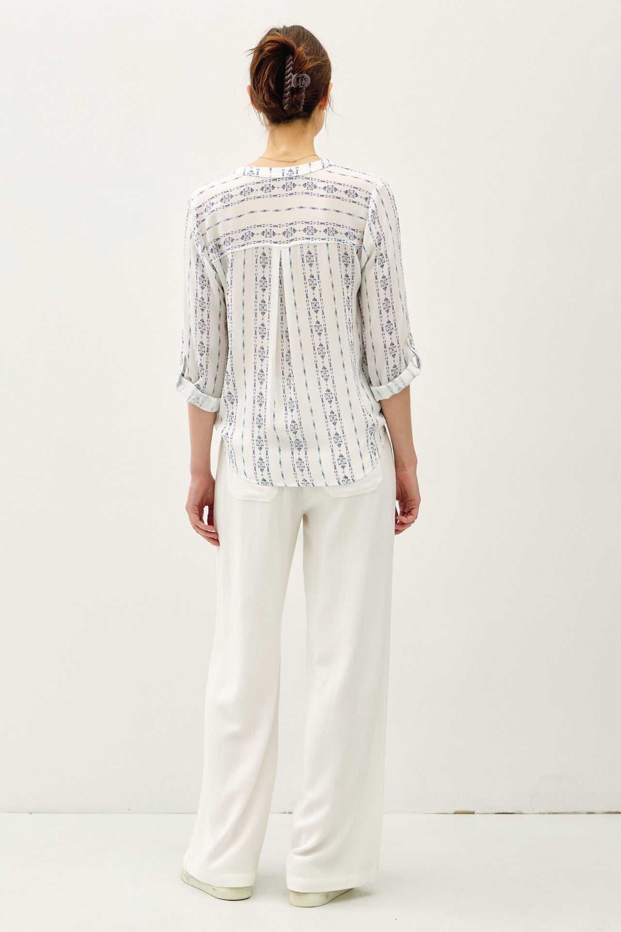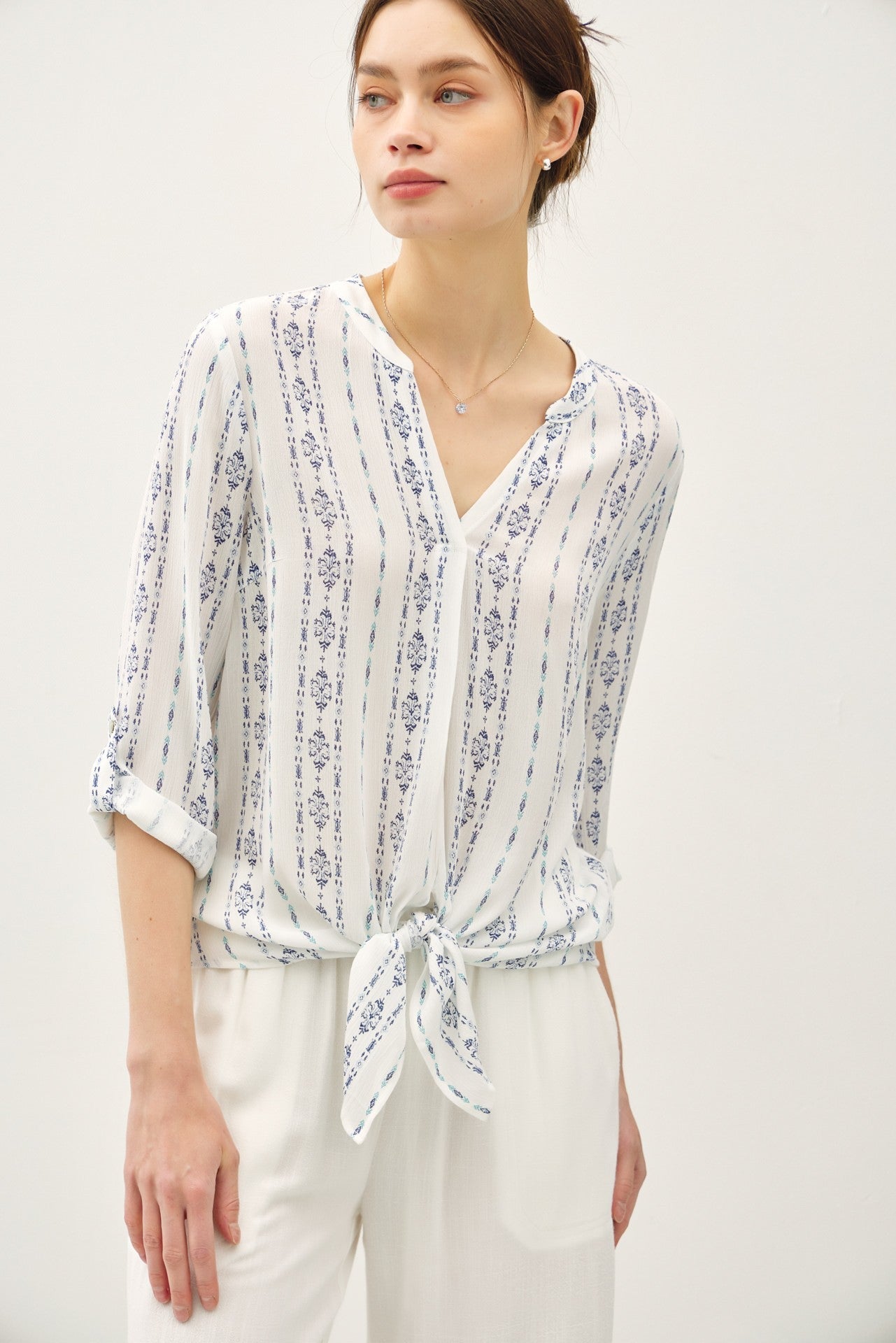 COMFY * EASY-TO-WEAR * MANDARIN COLLAR * SHIRT * 3/4 SLEEVES WITH ROLL TAP CUFFS * TIE * HIGH-LOW HEM * ROUND HEMLINE * BACK YOKE WITH PLEAT * ONE COLOR PATTERN.