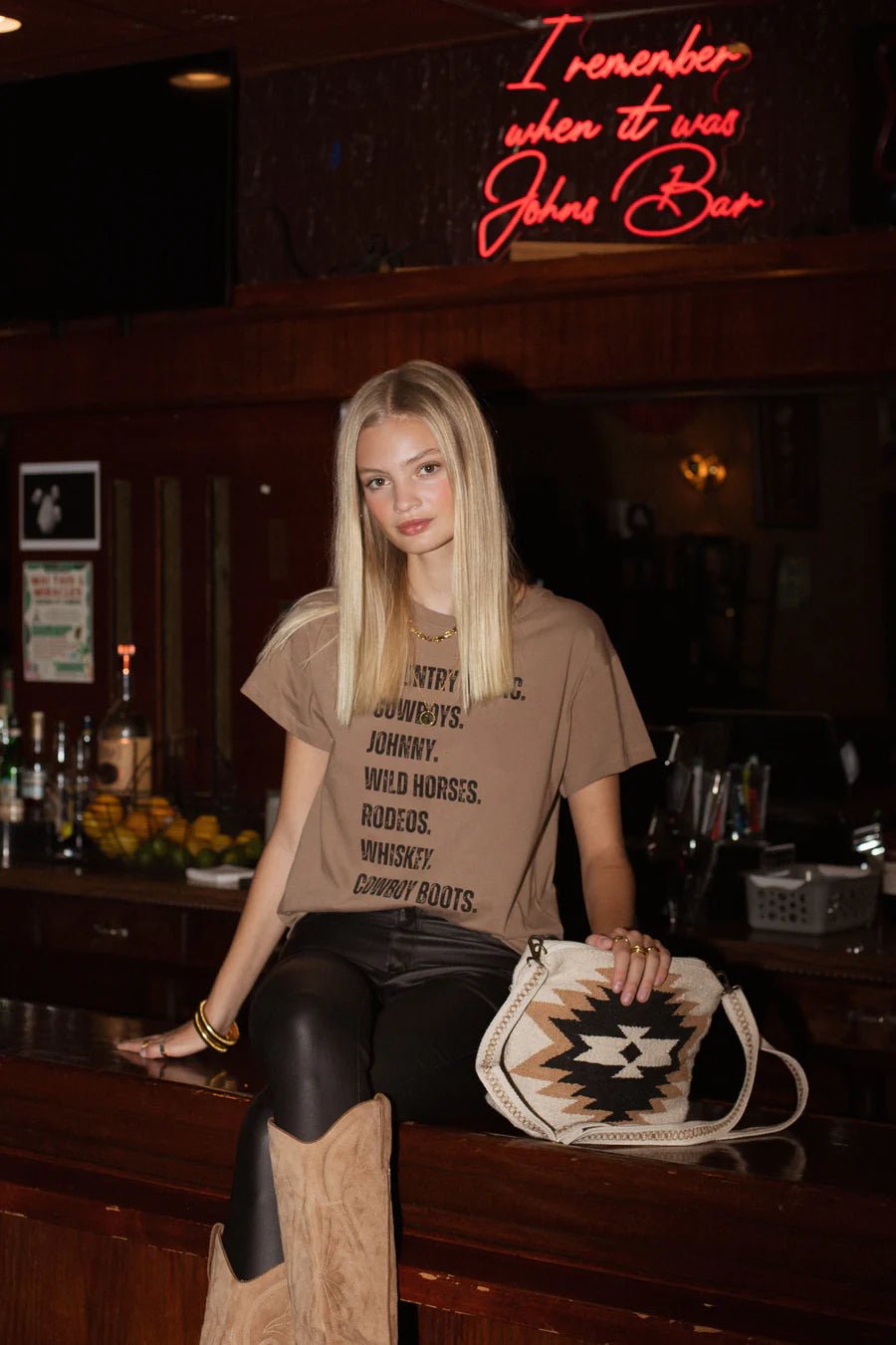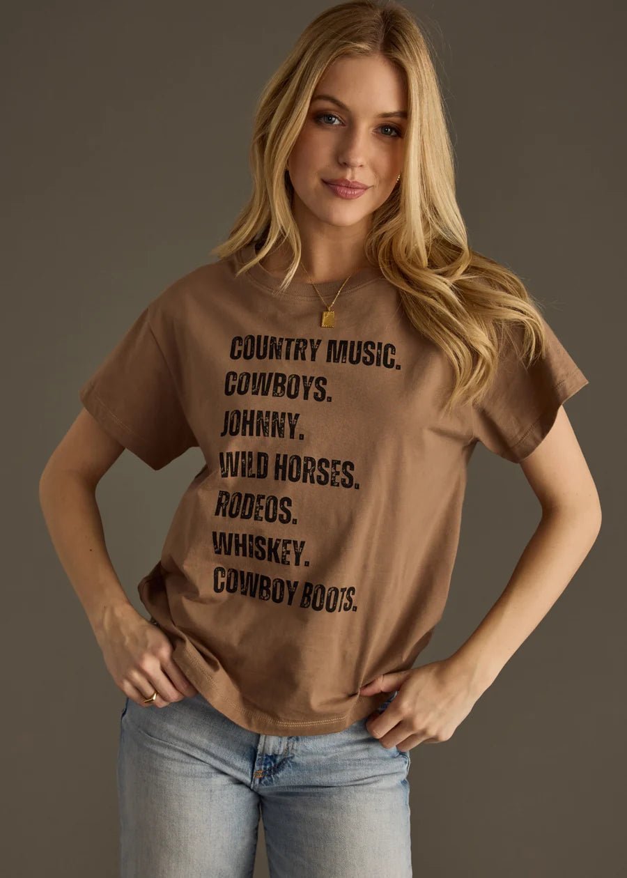 Featuring a bold list design showcasing Country Music, Cowboys, Johnny, Wild Horses, Rodeos, Whisky, and Cowboy Boots, this shirt is a love letter to the open range lifestyle.