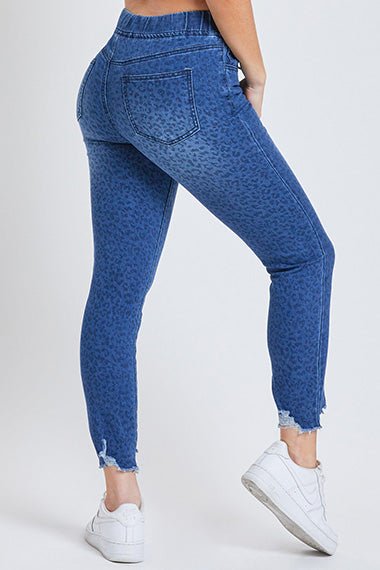 Switch up the basic denim in your wardrobe with our Indigo Leopard Print Denim Ankle Joggers. Feel cool and look casual with this pair's perfect high-rise fit. Featuring five-pocket construction, an elastic waistband with drawstring front tie, distressed detailing, and frayed hem.