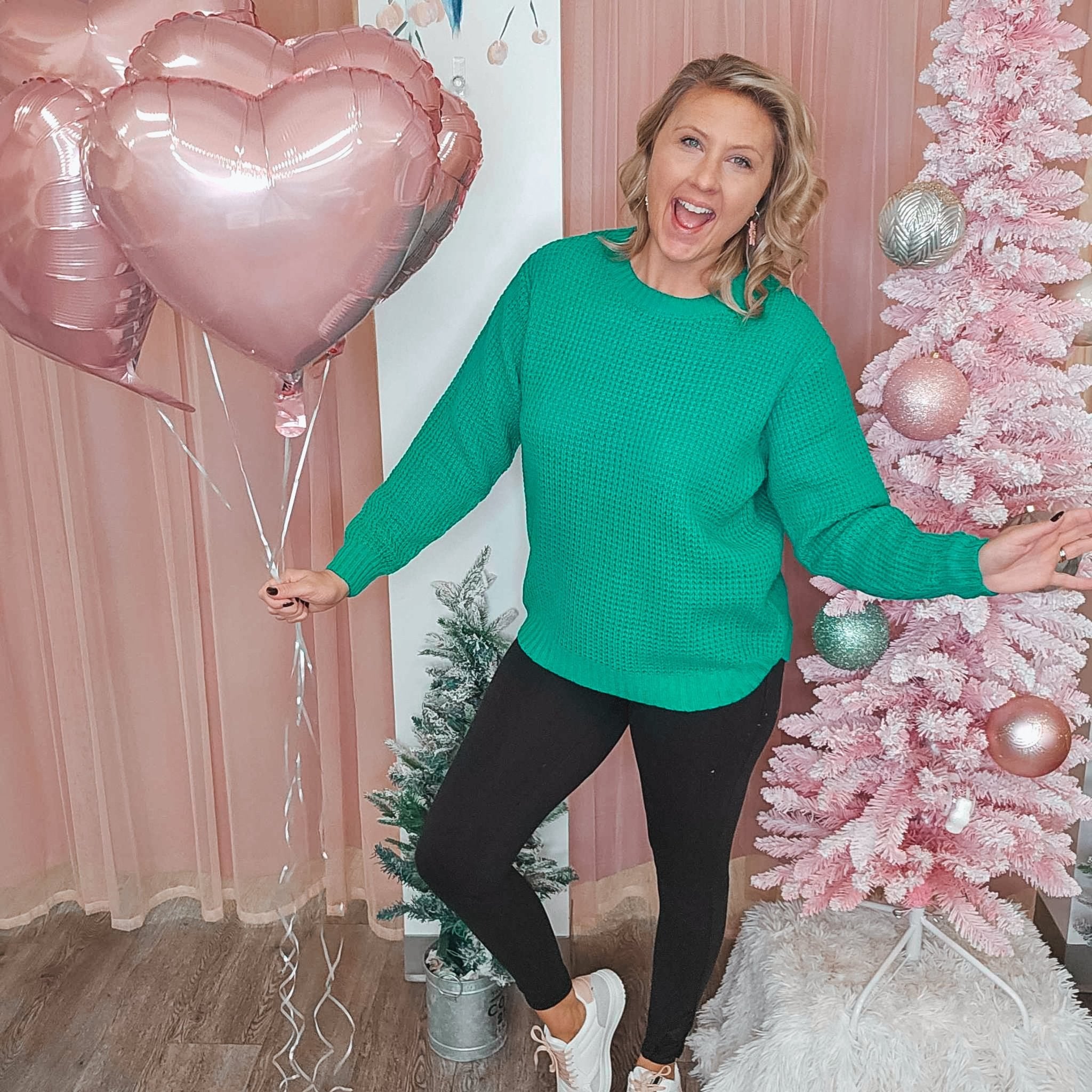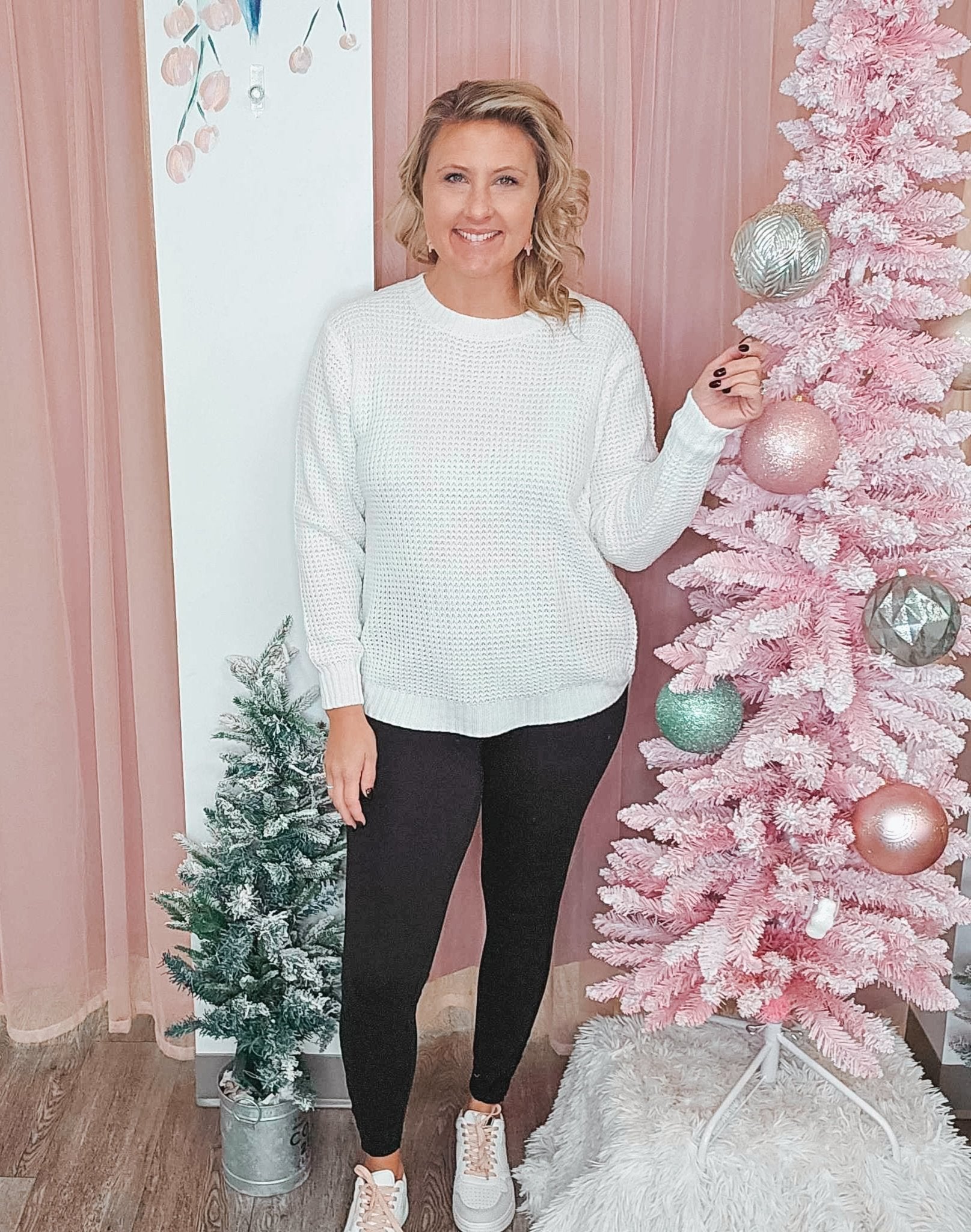 Ashley wears a Small with jeans and Medium for extra coverage with leggings.