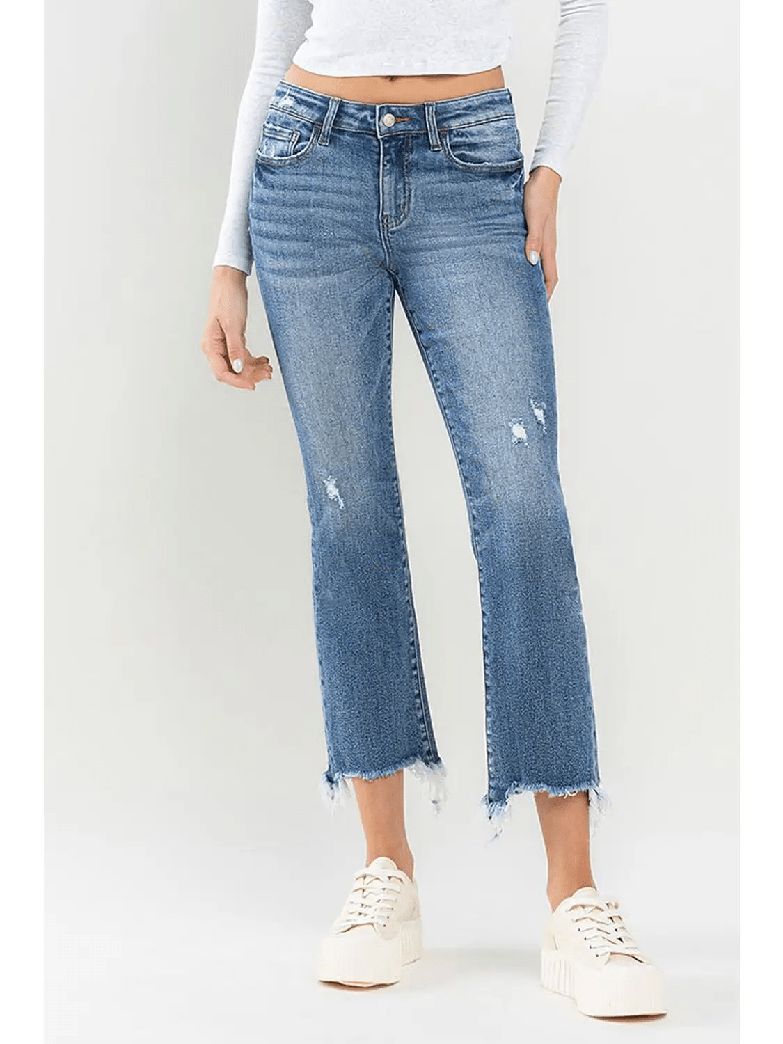 MID RISE ANKLE BOOTCUT JEANS COMFORT STRETCH DENIM, MID RISE WAIST, DISTRESSED DETAIL, ANKLE LENGTH, FRAYED HEM, BOOTCUT JEANS.