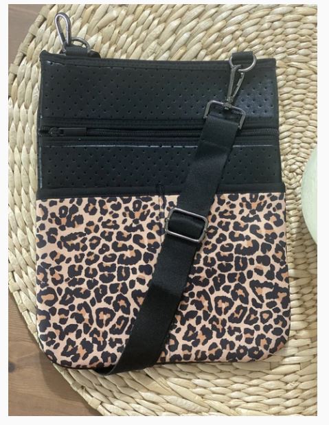 Crossbody at it's best! Neoprene body with top zip and hidden front pocket zipper. Lined with interior zip pockets and slots.