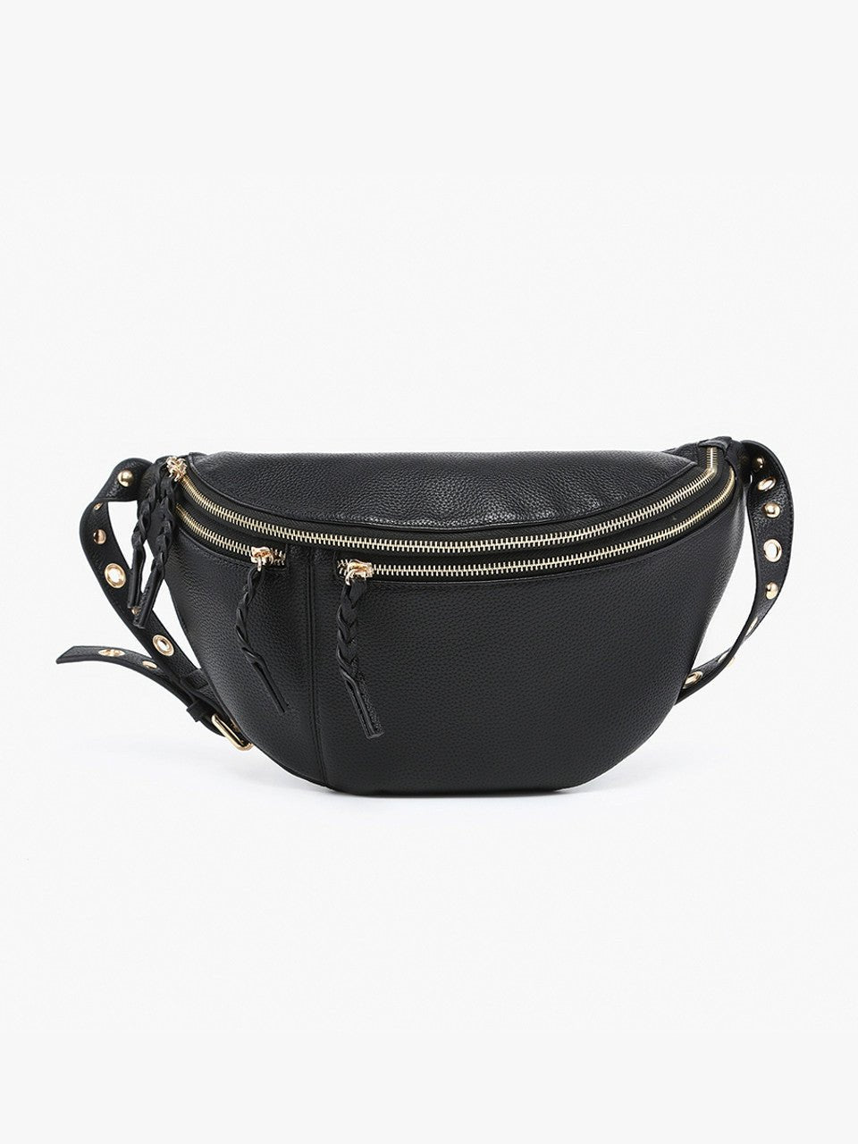 The Nova Studded Sling Bag with Braided Zippers is ideal for those looking for a compact, stylish, and functional bag with a bold, all season ready design.