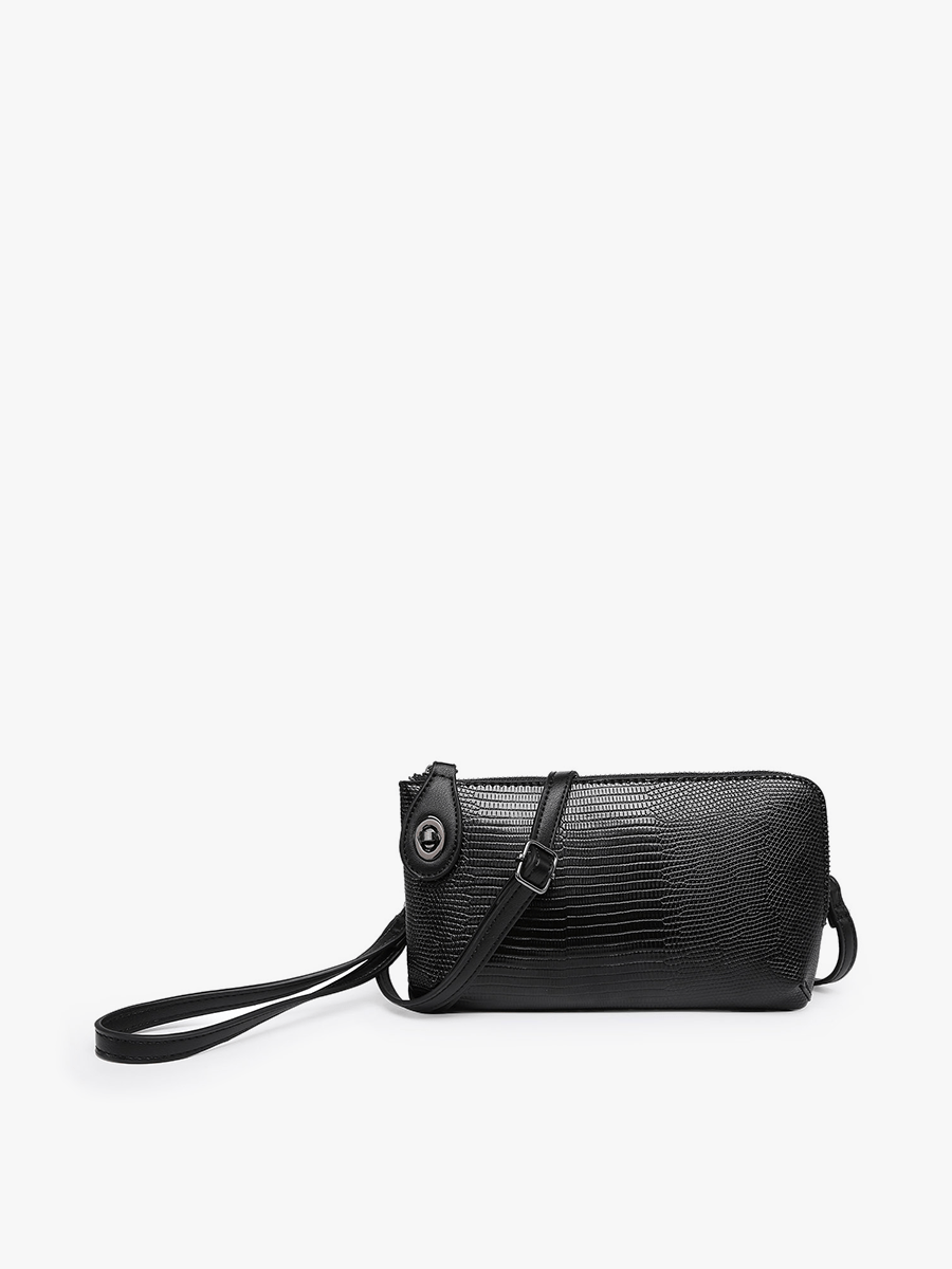 Inner card holders are inside. Both a wrist strap and a shoulder strap are included so you can use it as a clutch or wear it as a crossbody bag.