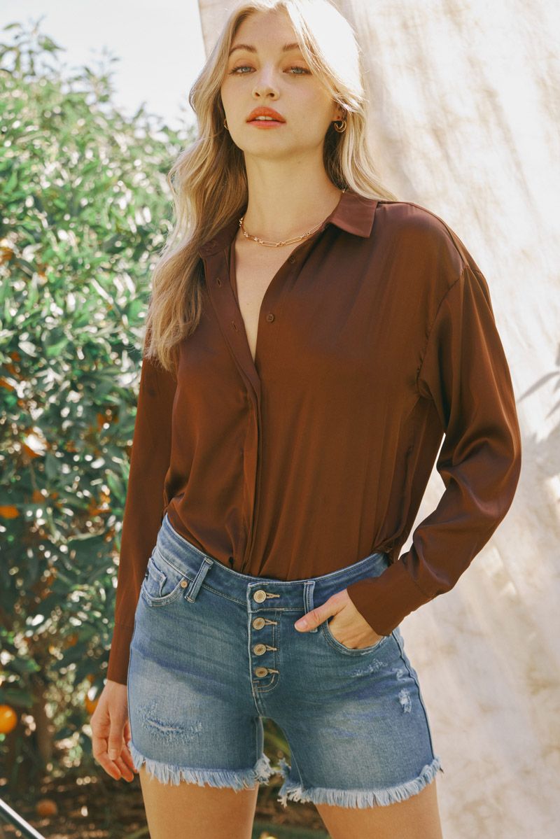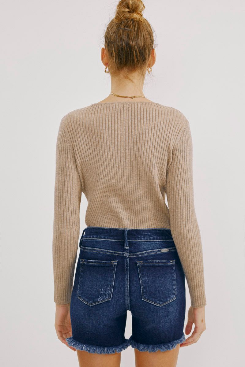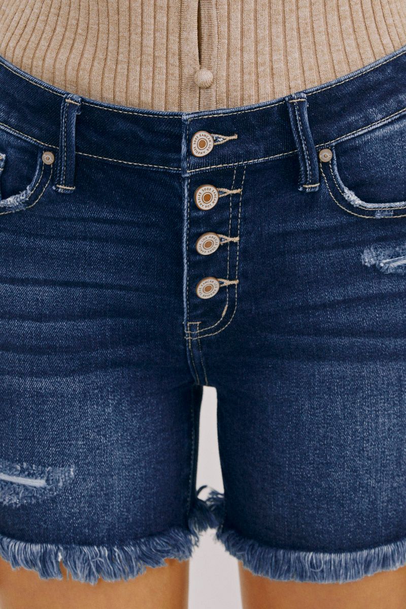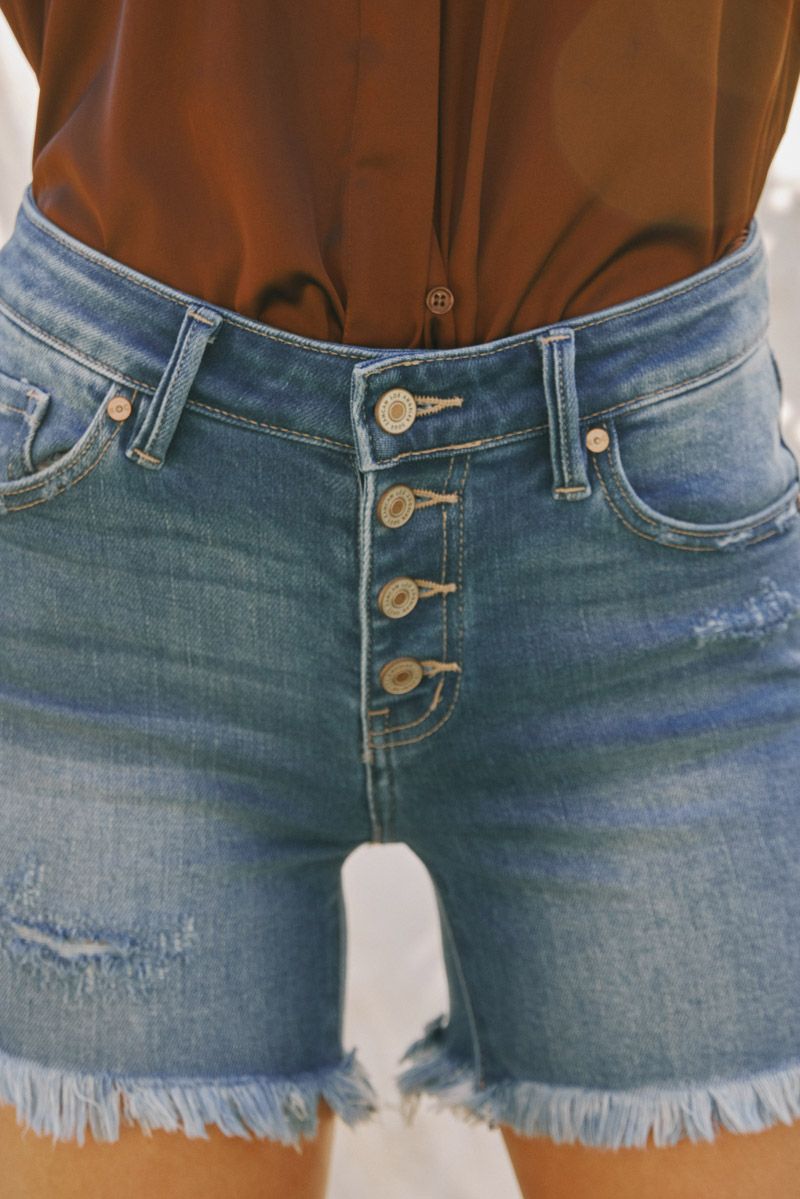 Our Justine Mid Rise Shorts come in a blue wash with minor fading, whiskering, and distress on both the front and back. Featuring a button-fly front that accents this style's mid-rise waist for a more slender silhouette. This design also comes with a frayed, raw hem that creates a worn-in look that will complement your most laidback fit.