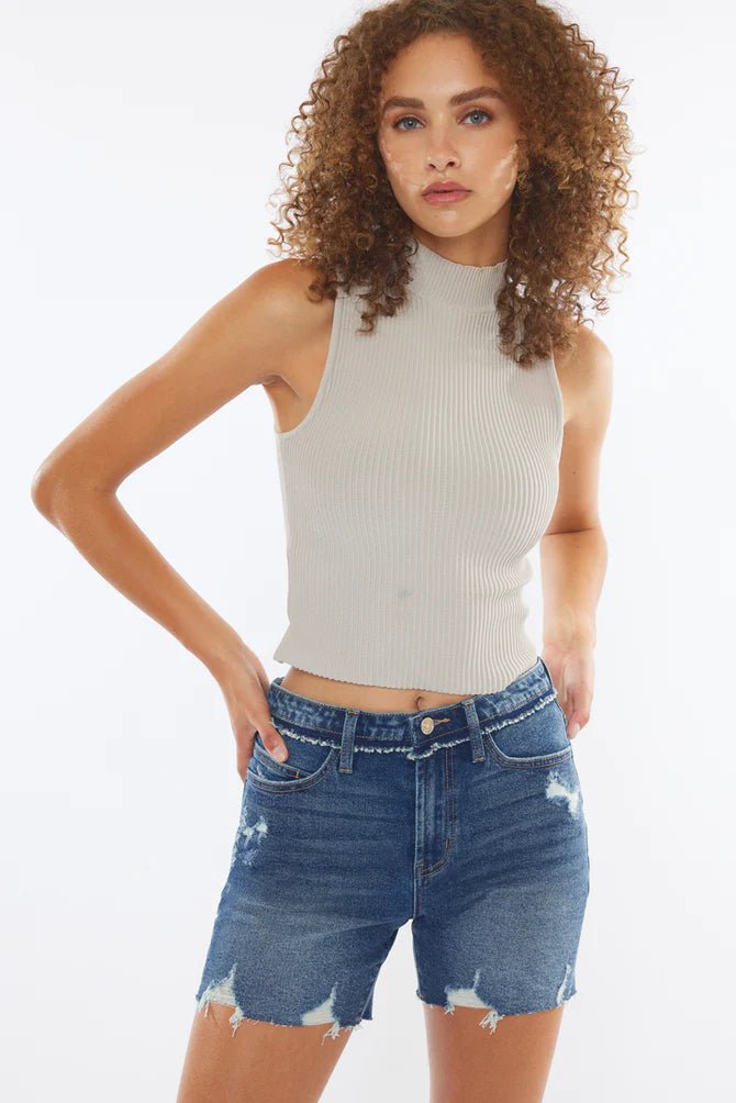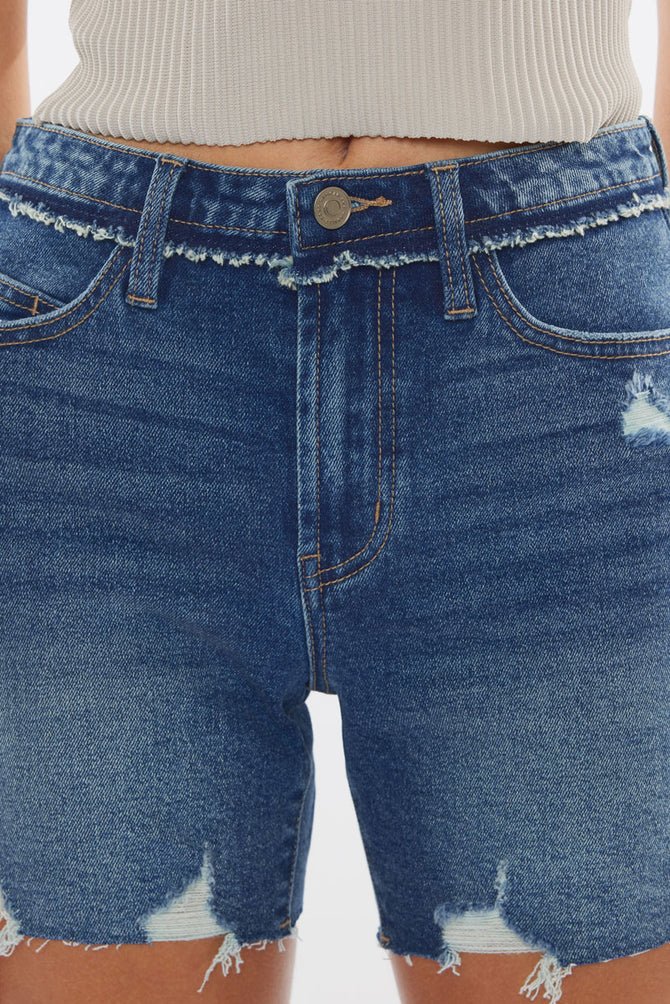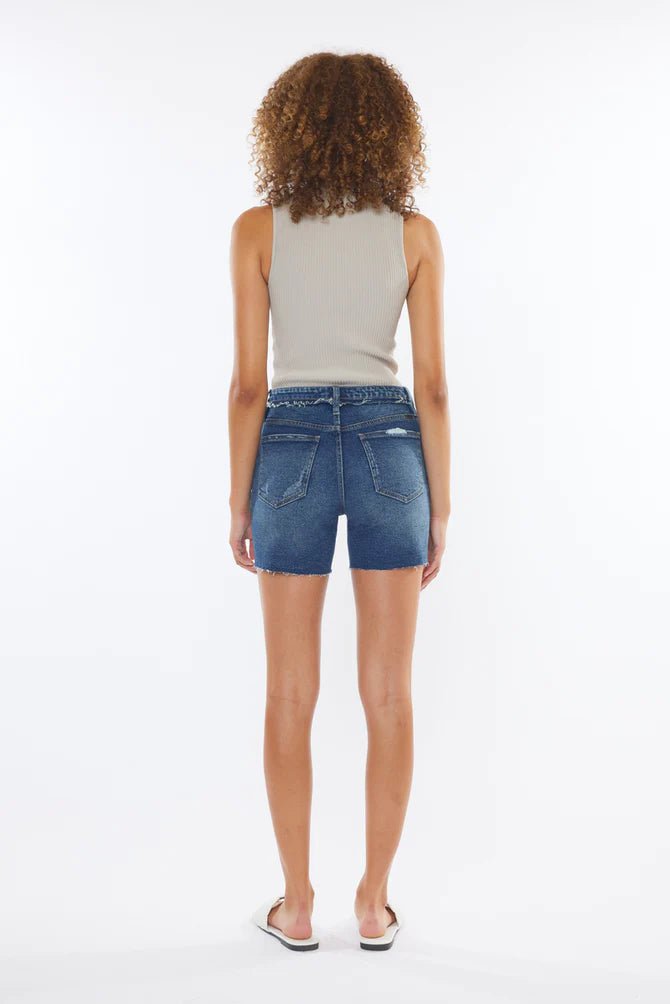 Our Kari High Rise Mid Shorts are here! These stylish and comfy shorts come in a dark wash with medium distress, whiskering, and a raw, frayed hem. It sits on your waist and hugs your silhouette with a unique frayed waistband design. Features a 5-pocket style, single front button closure, and zip fly.