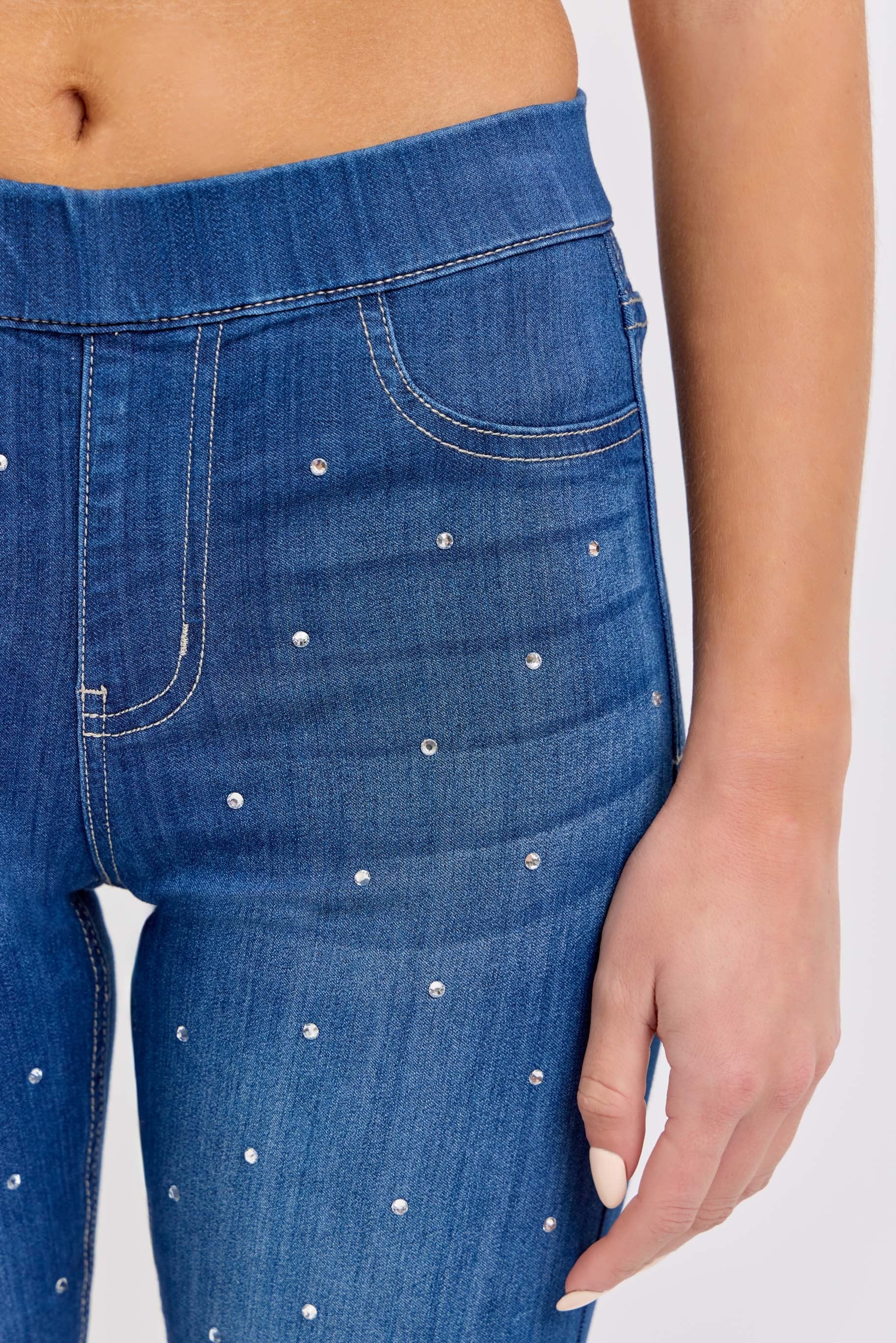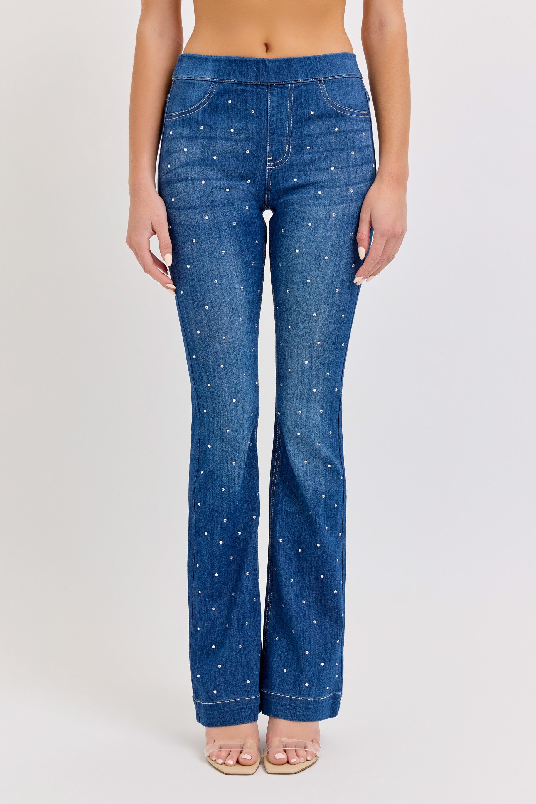Mid-rise Flare jeggings Rhinestones Dark Wash Elastic Pull On Waistband Import Front Rise 9", Inseam 33"