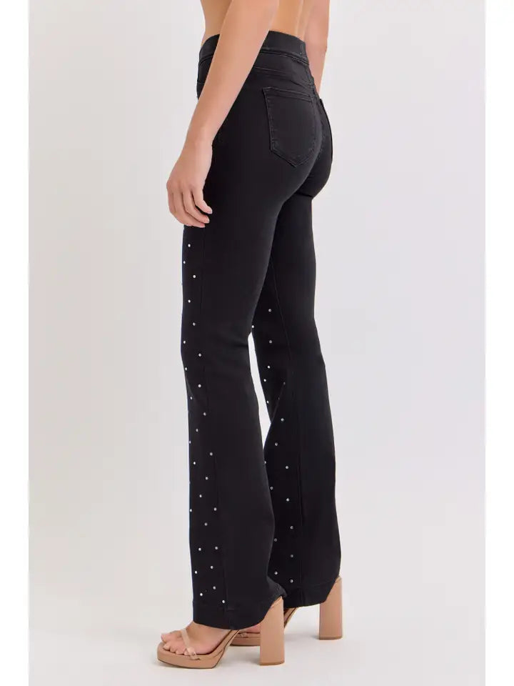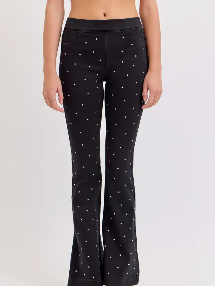 Add a sparkling twist to your wardrobe with the Cello MR Crystal Crush Rhinestone Flare Jeggings. Featuring playful rhinestone accents that catch the light just right, these pull-on pants offer both comfort and style. The flared hem adds a fun, retro vibe, making them perfect for a night out or elevating your everyday look with a touch of shine.