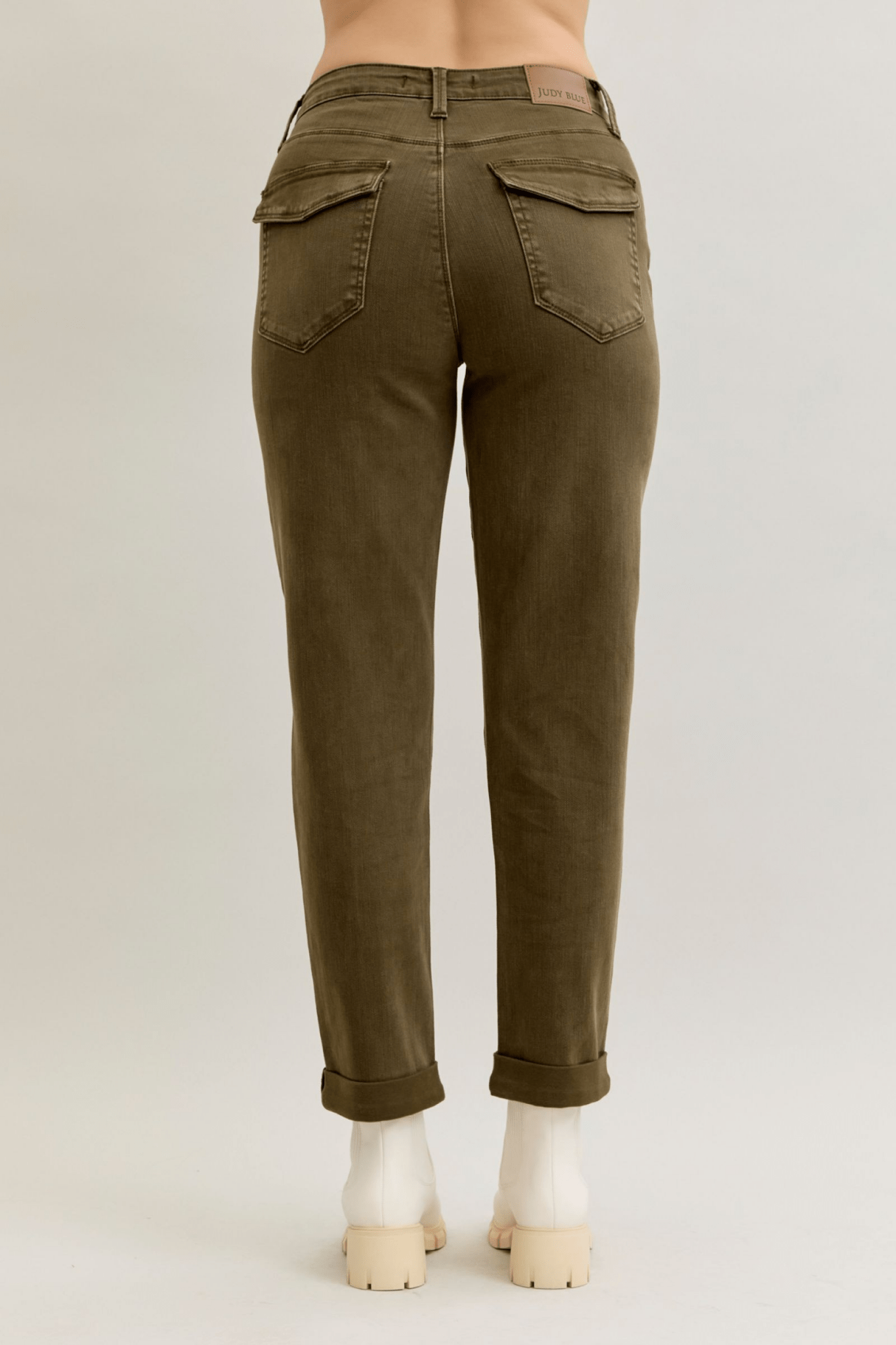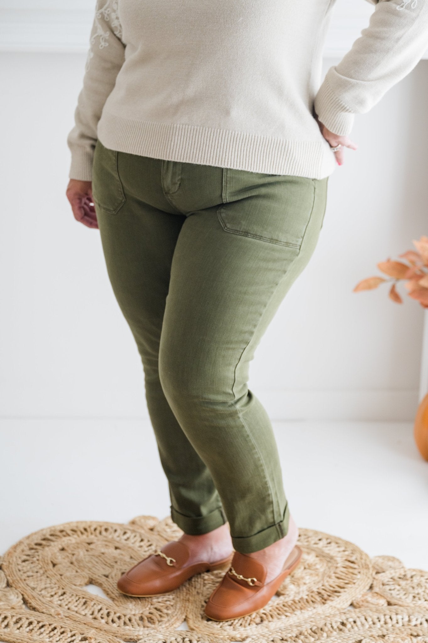 Step into style with the Judy Blue Aurora Weekender Cuffed Jeans, featuring a one-of-a-kind deep green hue that adds a fresh twist to your denim collection. The playful back flap detail gives these jeans a fun, unexpected edge, while the cuffed design keeps your look effortlessly cool. Perfect for weekend adventures or casual days out, these jeans blend comfort and charm in every stitch.