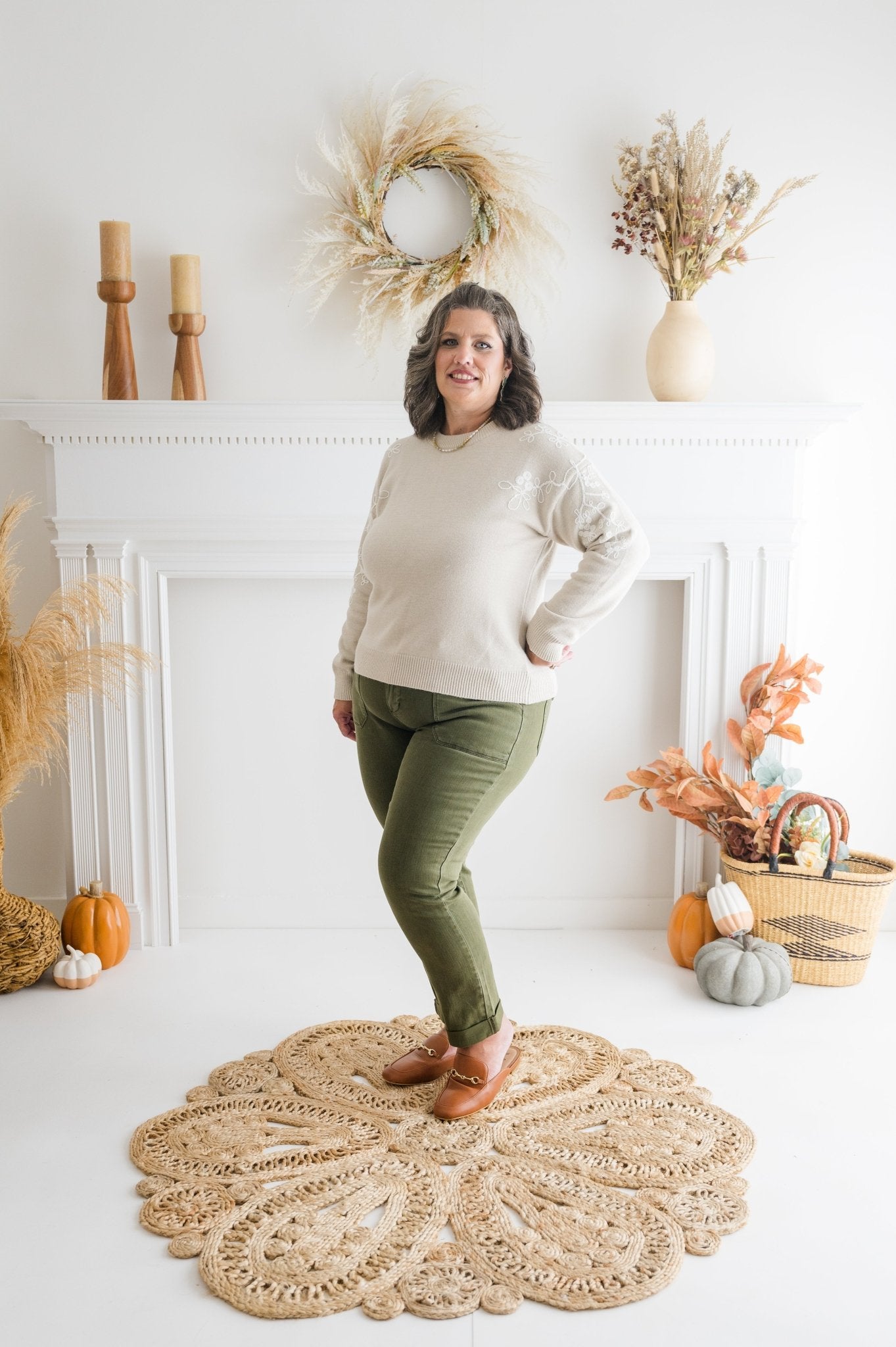 Dar paired her bottoms with are gorgeous Stories Unfold Embroidered Sweater!