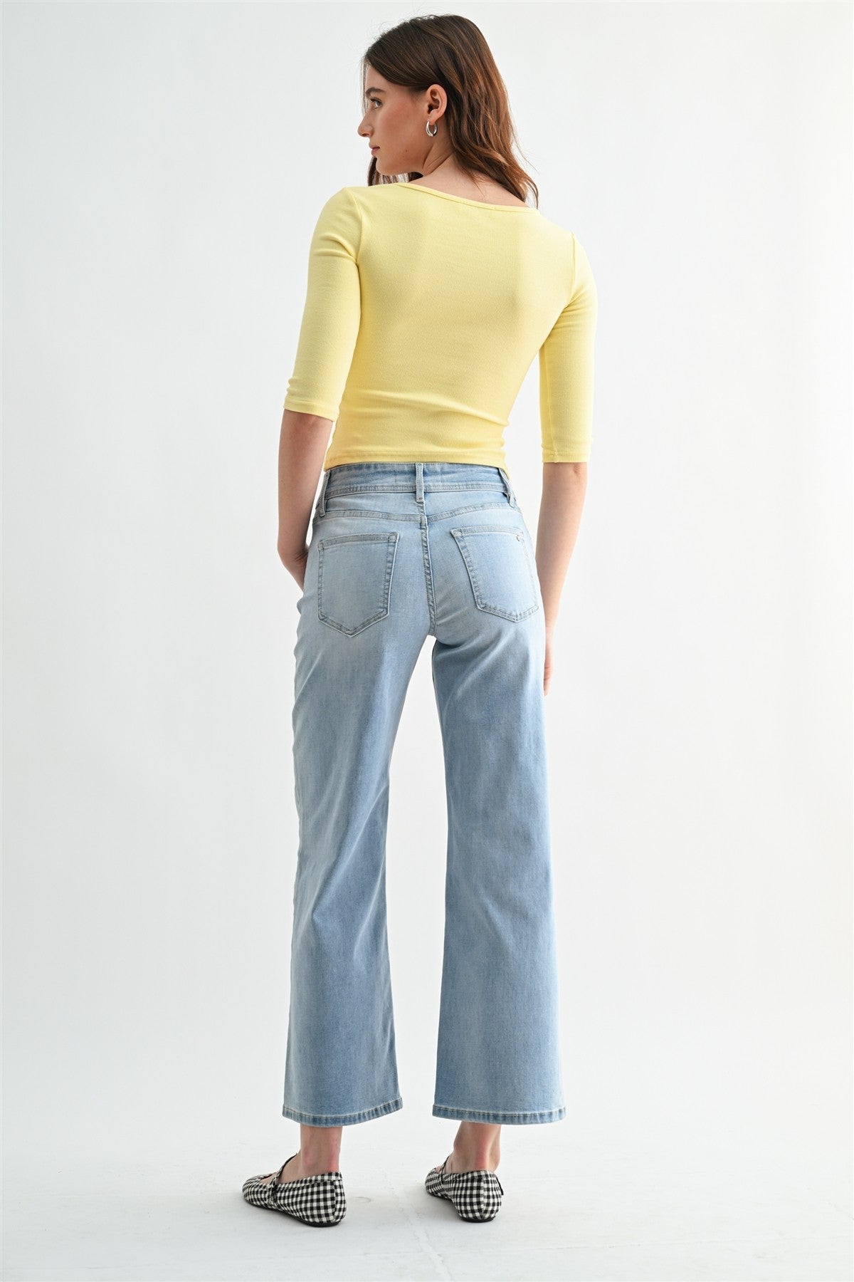 Clean look, wide leg ankle jeans.