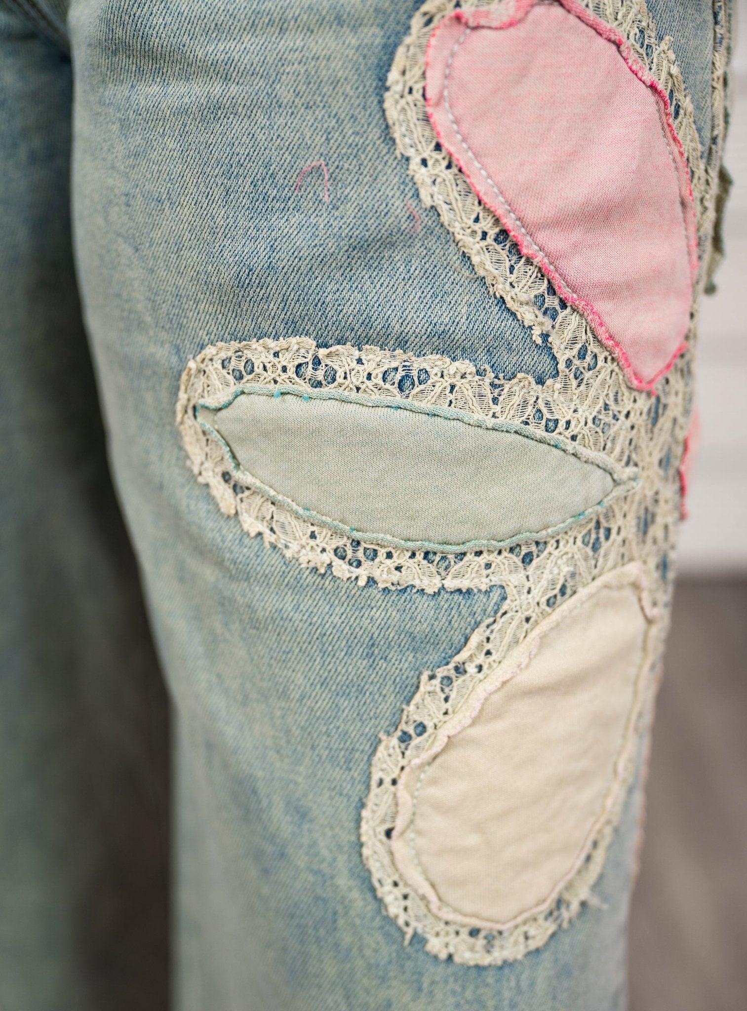 These jeans feature a 5-pocket design, elastic waistband, cuffed hem, flower patch design with lace detailing, and a relaxed, wide leg fit.
