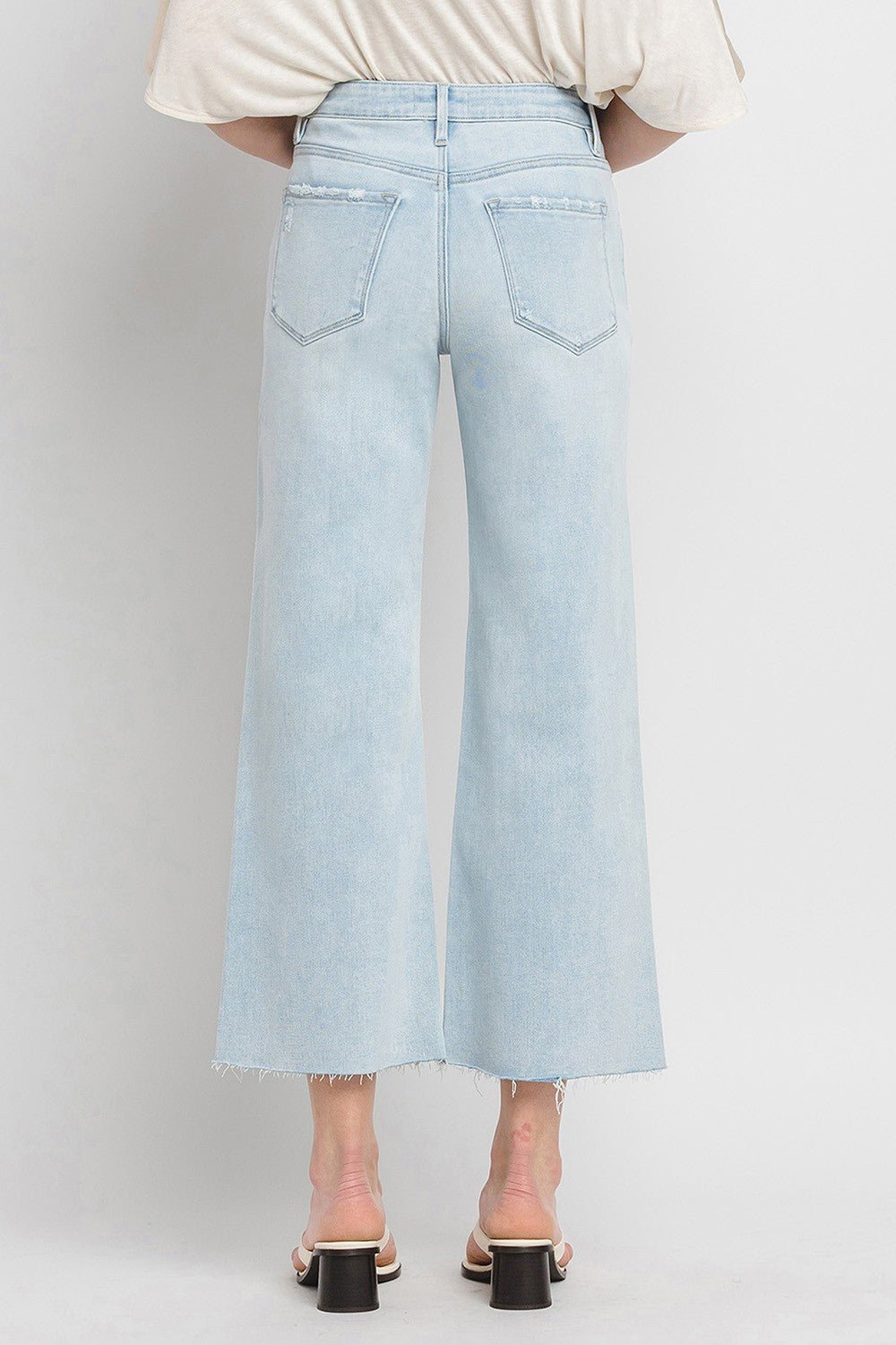 HIGH RISE WIDE LEG JEANS, COMFORT STRETCH DENIM, HIGH RISE WAIST, CLEAN CUT RAW HEM, CROPPED LENGTH, WIDE LEG JEANS