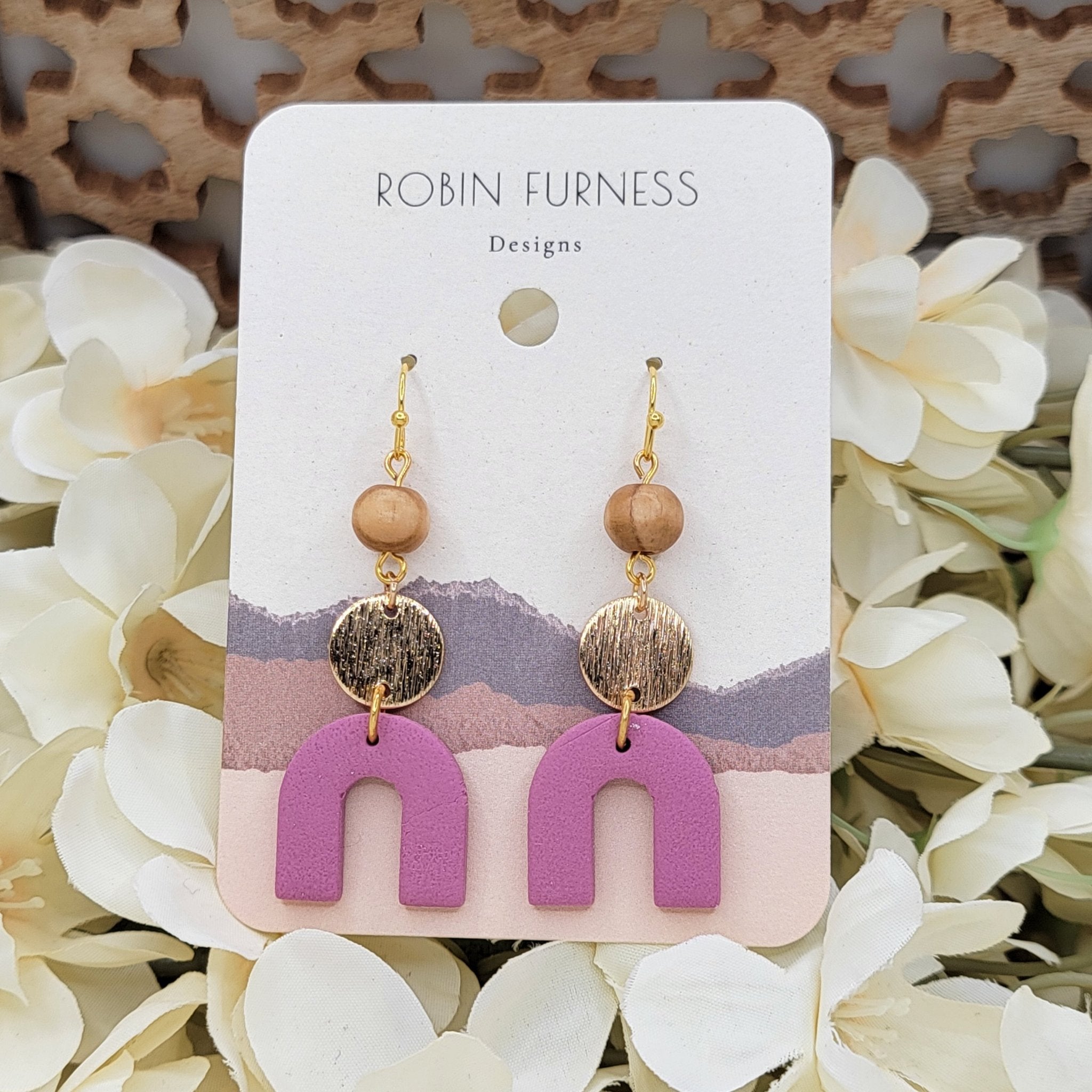 Half circle color charm on a wood bead and gold hammered round dangle. Get your jewelry looks rolling with these gorgeous dangle earrings!