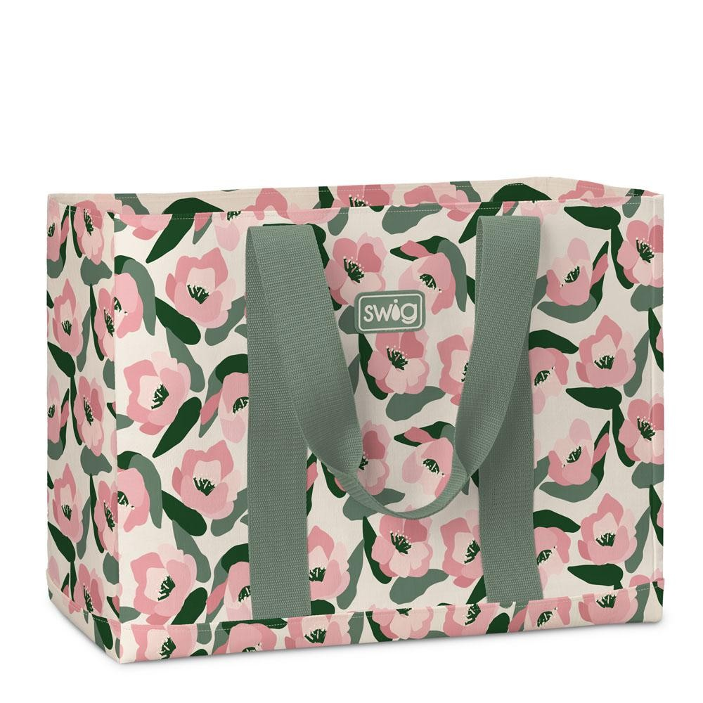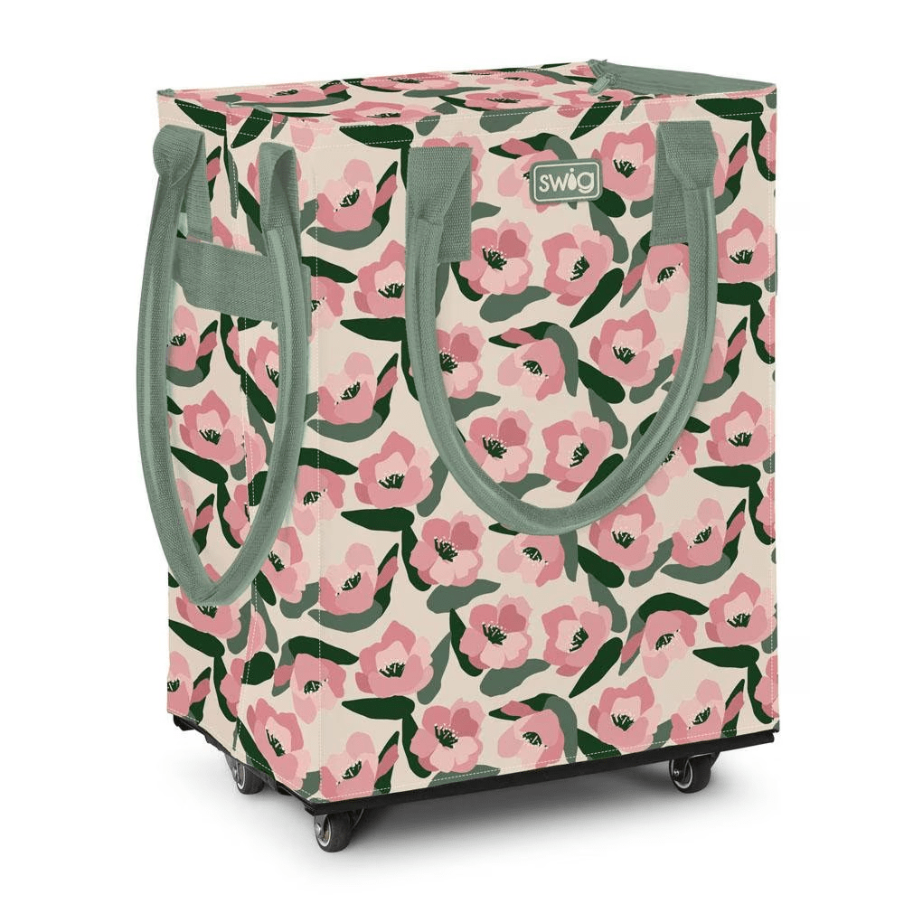 Swig Life's Mega Tote Bag on wheels is made for all of life's adventures. From the farmer's market, ballfield, and girl's weekend, this large durable swivel bag will make hauling easy! Zip cover keeps items protected and features a wide pocket for easy access items.