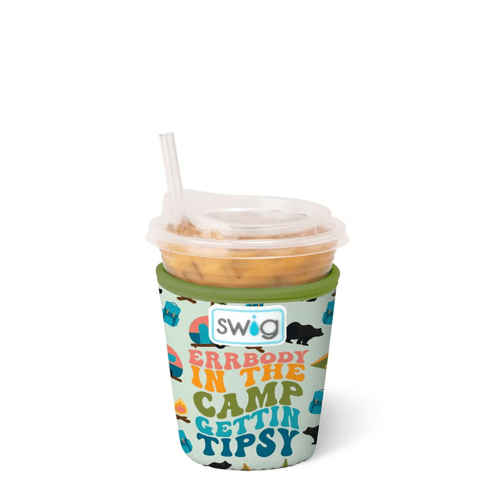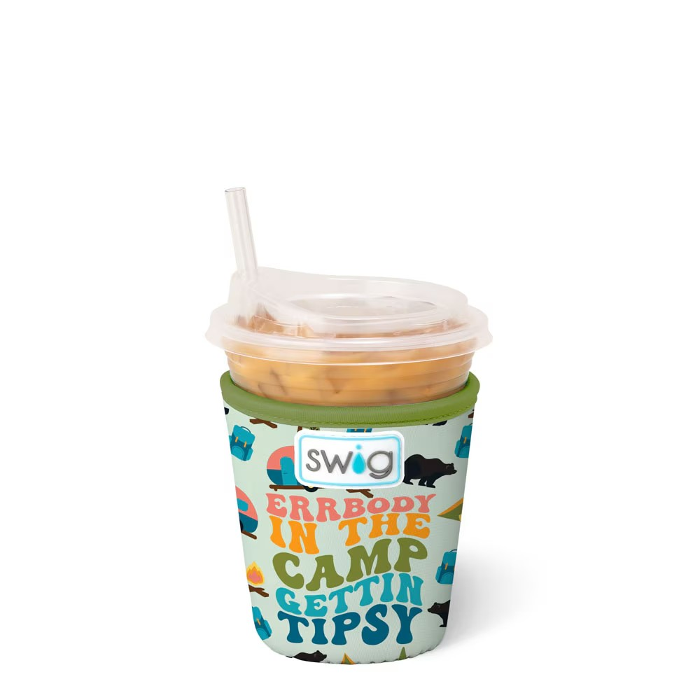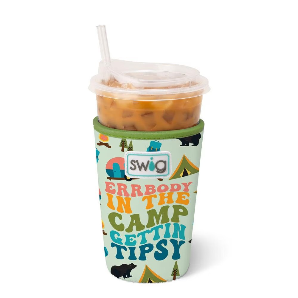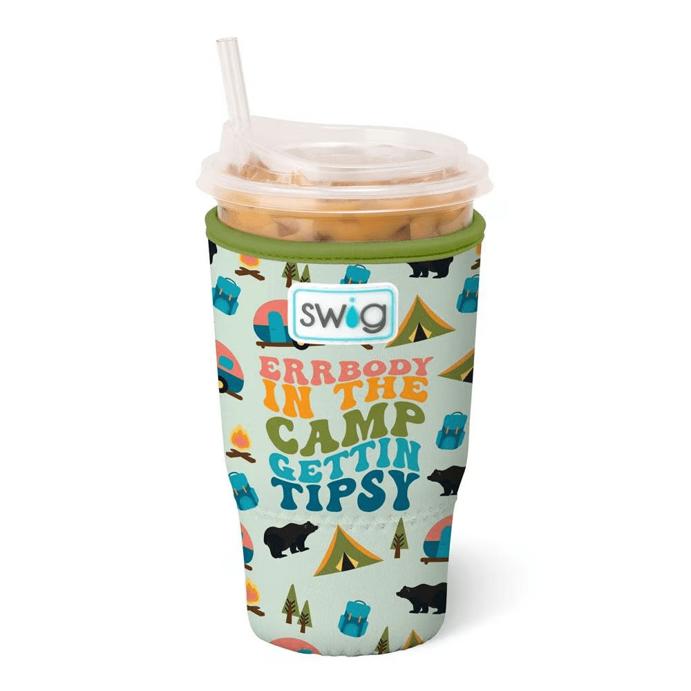 Errbody this summer is getting tipsy with Swig! 🍹 This drinking buddy design comes party ready with tents, bears, and campers on a pale green background.