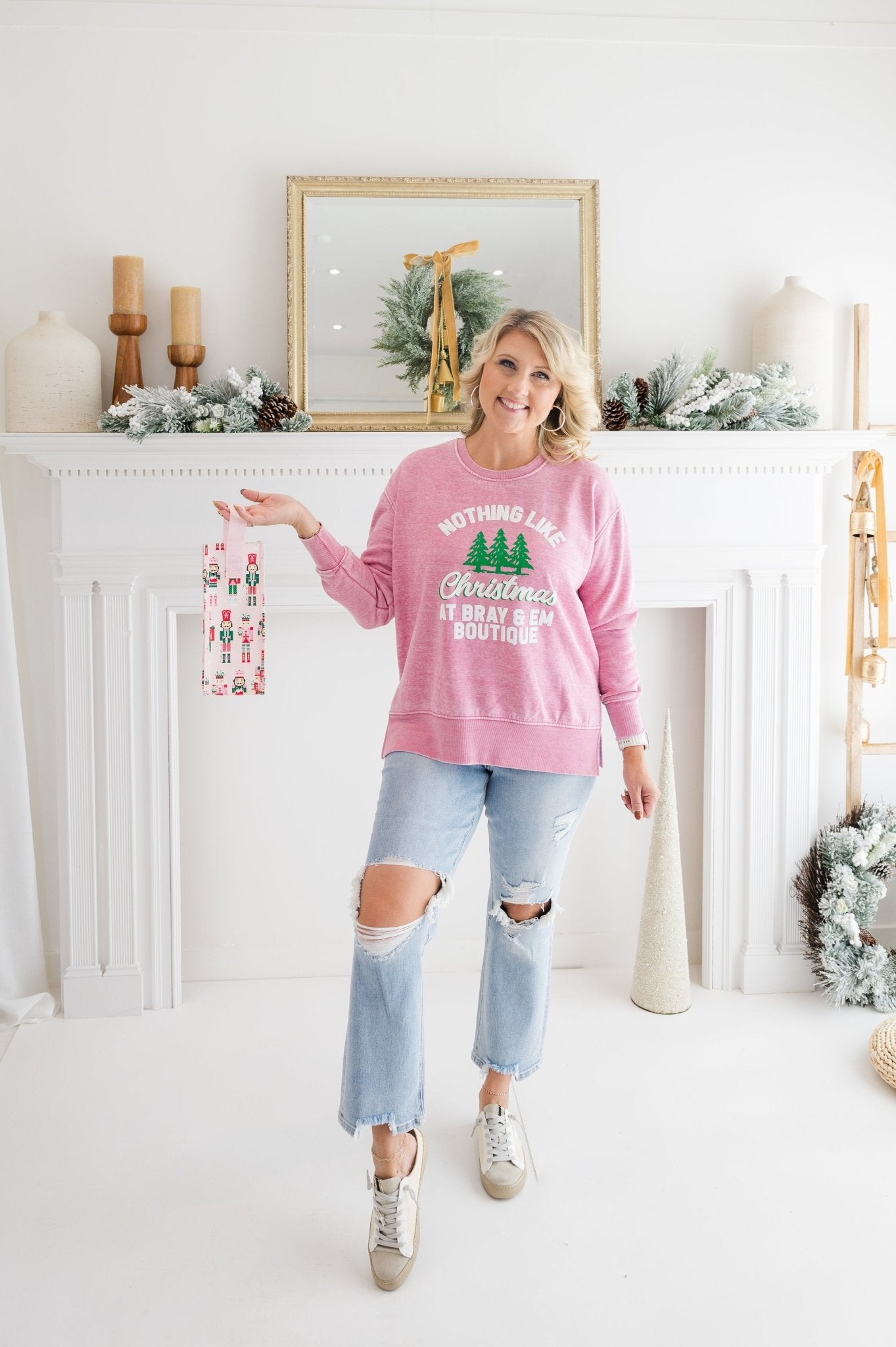 Give the perfect gift for any kitchen with this stylish tea towel! Festive toy soldiers dressed with peppermints and holiday candy march around a pale pink background.