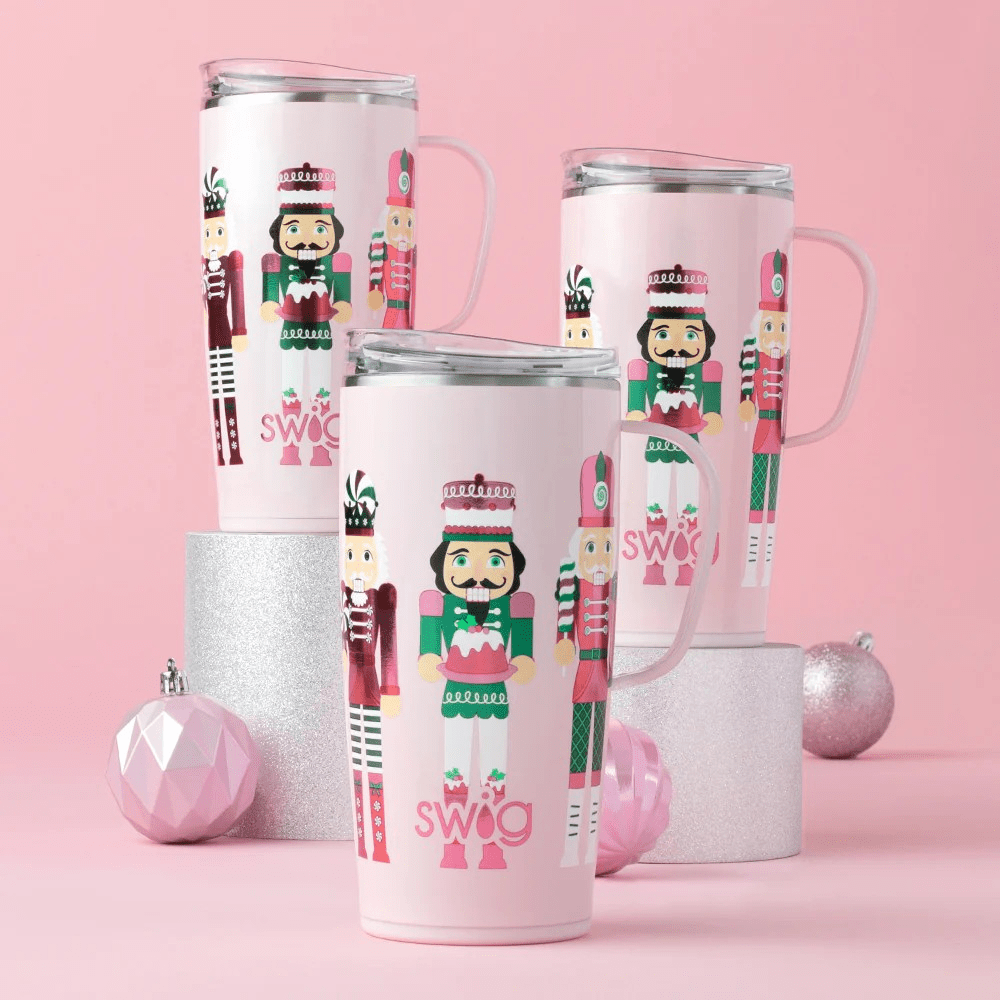 Mega sips, mega chill! 🧊 Metallic toy soldiers dressed with peppermints and holiday candy march around a pale pink glitter background.