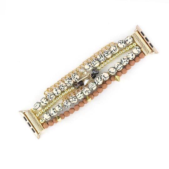 Wild- Put the wild into your wardrobe with this eye-catching cream, tan, and gold apple watch band! Poppin' with style, it's the perfect way to bring some pizzazz to the everyday. Mix and match with the season's hottest hues - your outfit will thank you!
