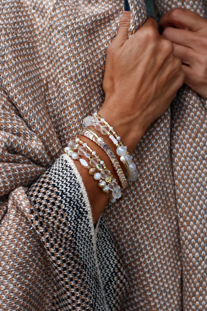 SILK - Add a wintery vibe to your outfit with this stunning array of bracelets. The collection features soft pink and purple accents for a subtle yet beautiful look. Perfect for layering!