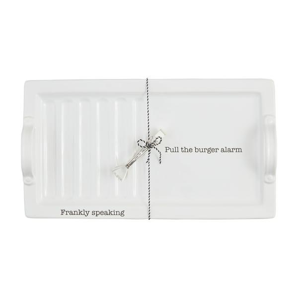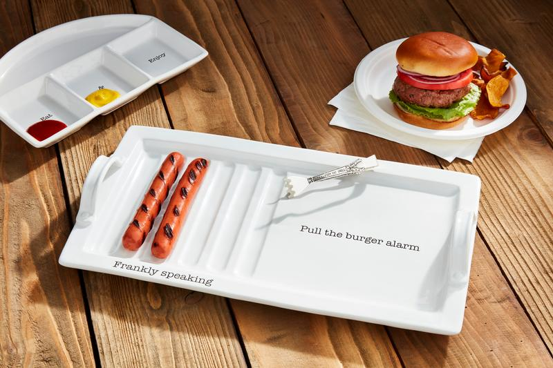 - Ceramic platter with grooves for hot dogs and flat area for burgers