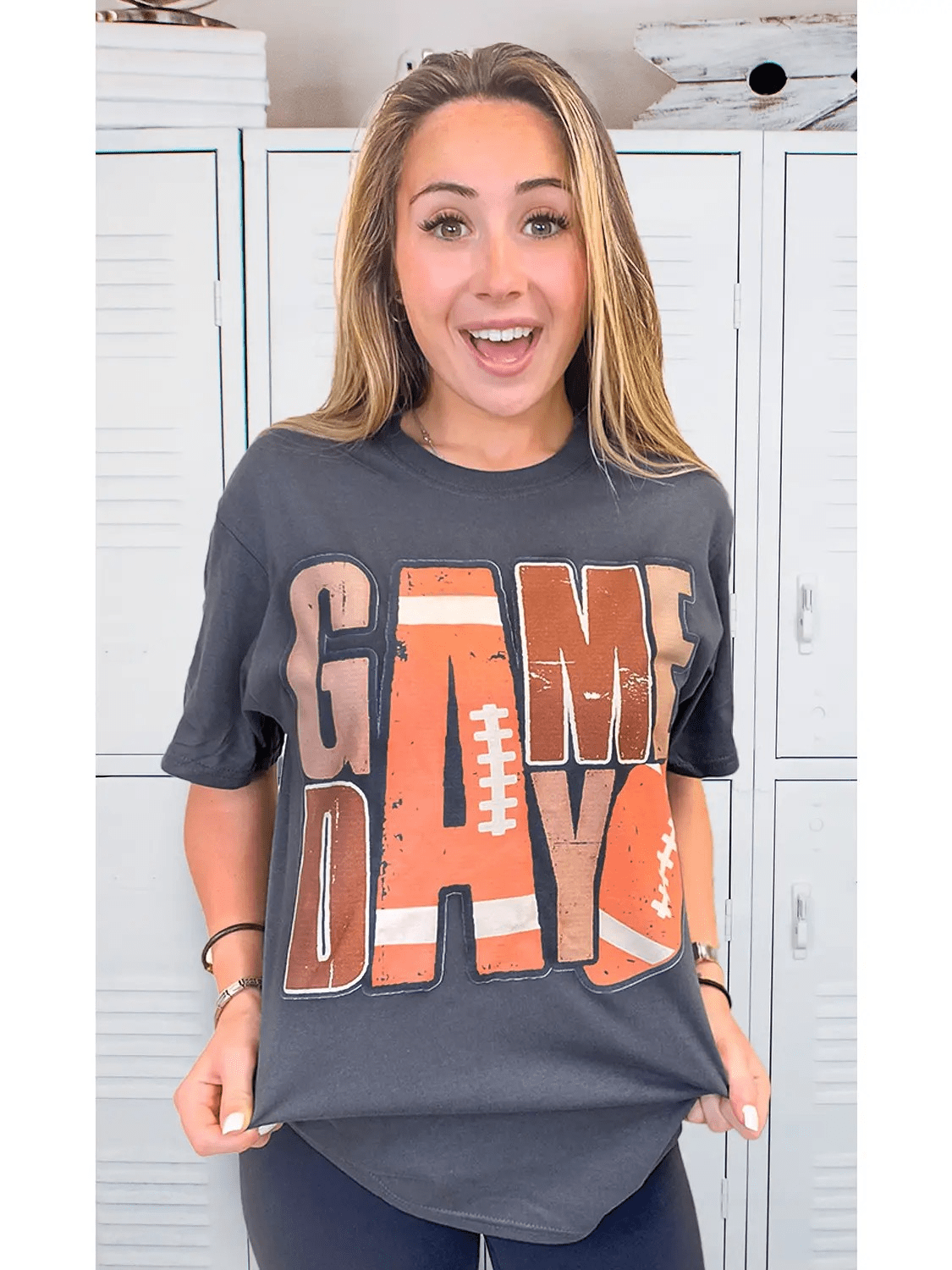 This graphic t-shirt's distressed design features the words "GAME DAY" stacked onto two lines, with a football incorporated in the design.