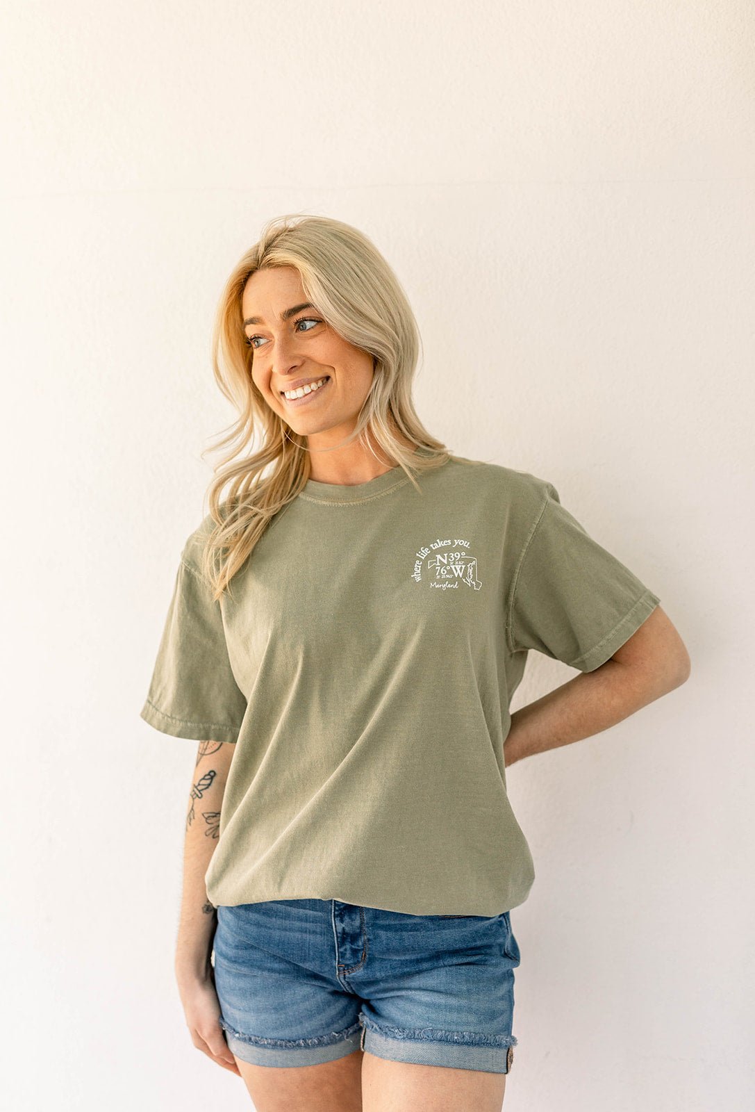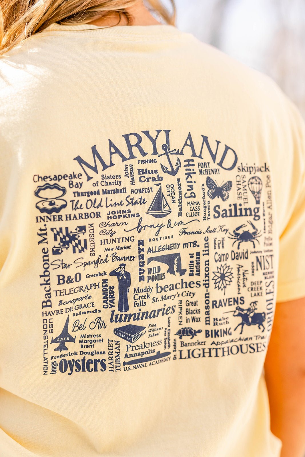 The Maryland College graphic tee in short sleeve. A collage of all things Maryland are found on the back, including yours truly, Bray And Em! Can you find it?