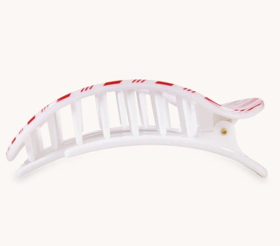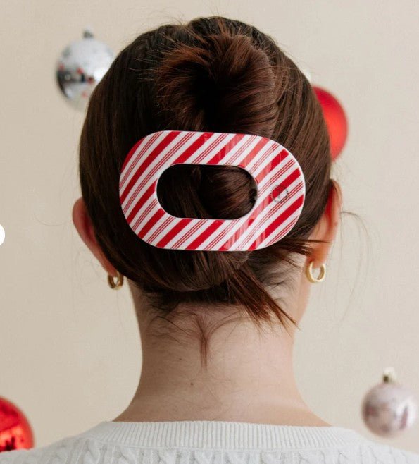 Lay flat and relax with the new TELETIES Candy Cane Crush Flat Round Hair Clip in Red and White Stripes. This hair clip is designed to allow you to lay back flat, do yoga, or sit comfortably in a seat with a headrest, and it is made with the same material that is nearly unbreakable.