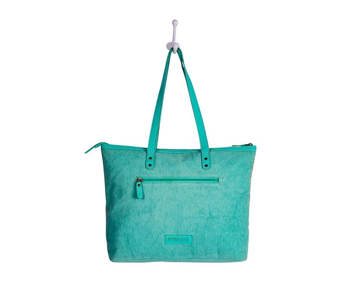 The bag is trimmed in beautiful turquoise leather, which continues onto the back; the back also has an extra zippered pocket. The carrying straps are in matching leather. Zipper-close top. Lovely!