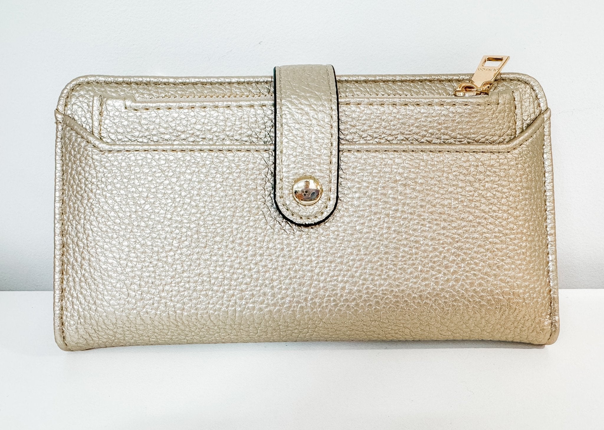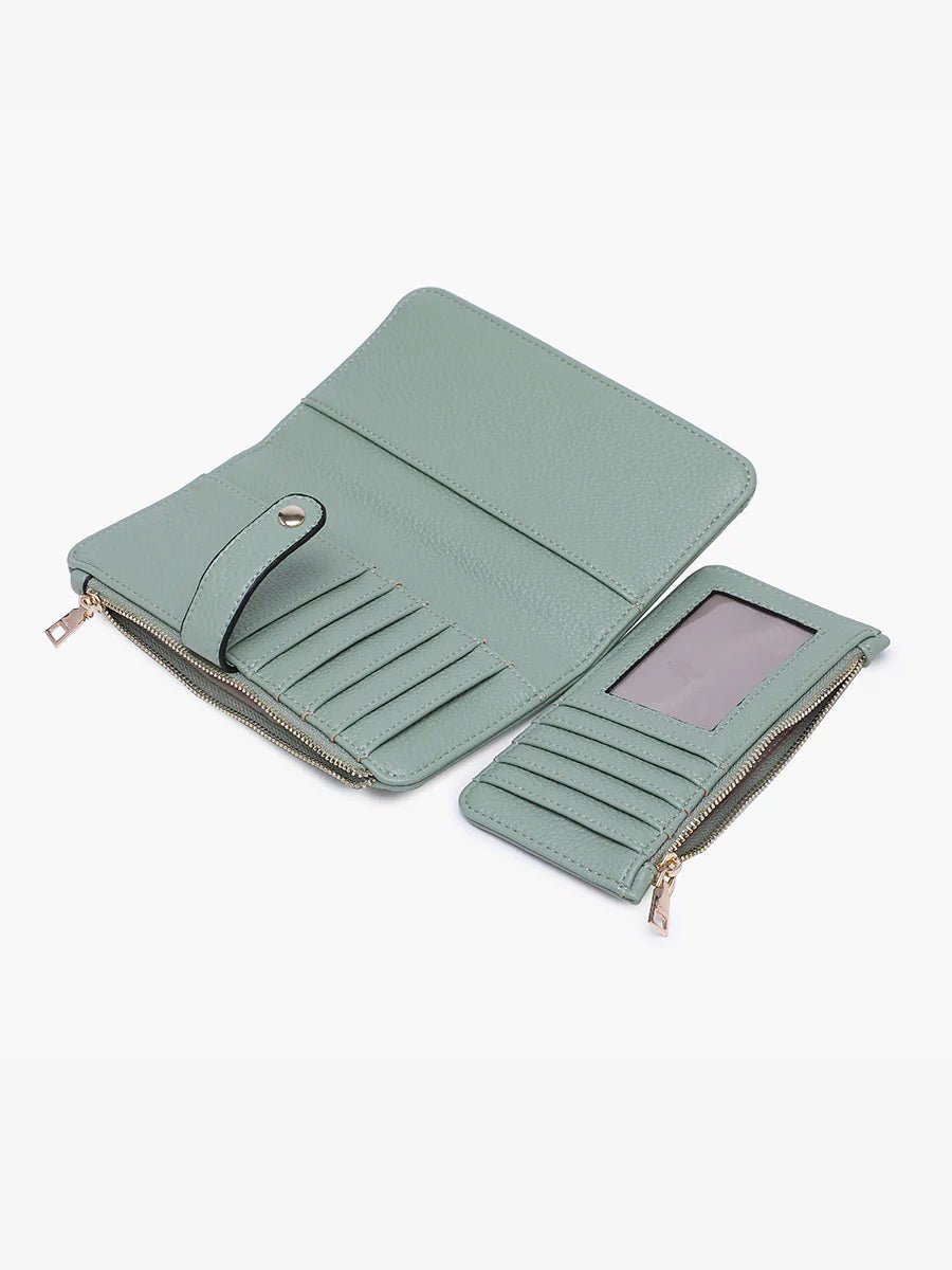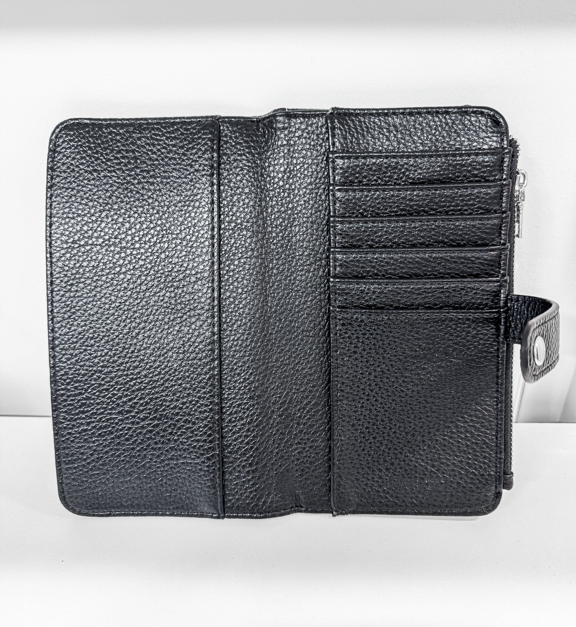 Fold out wallet with snap closure and top zip pocket. Front slip pocket with removable card slot wallet and zip pocket. Inner card slots and slip pockets.