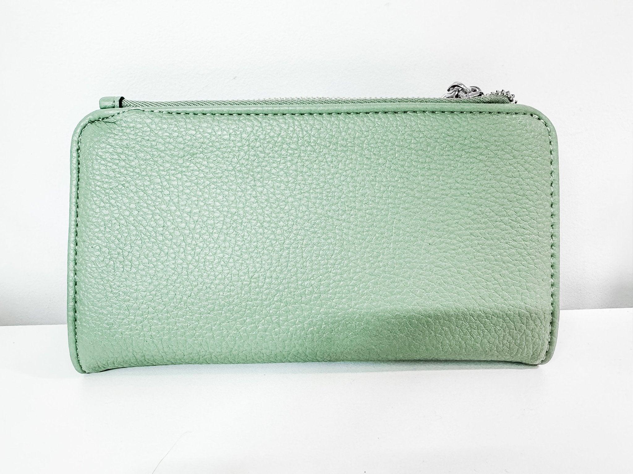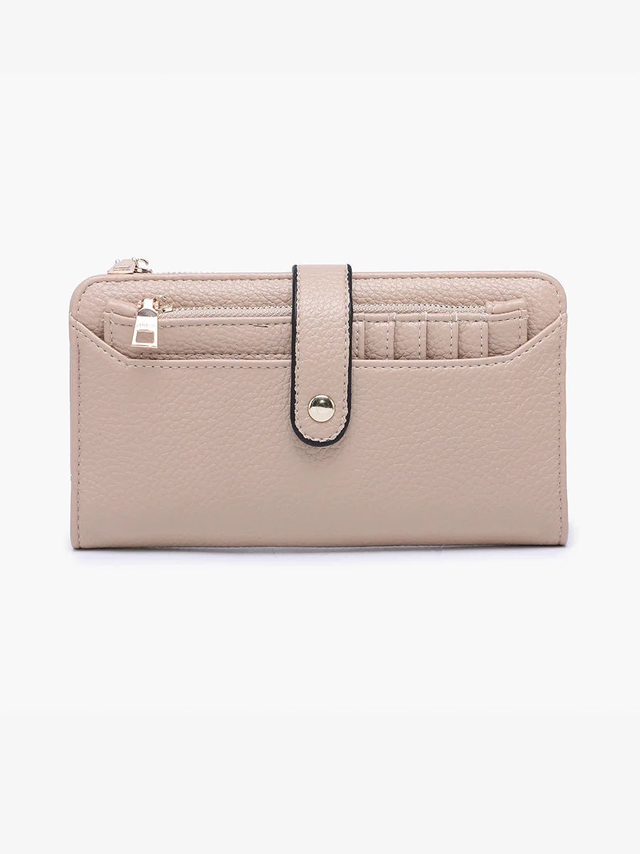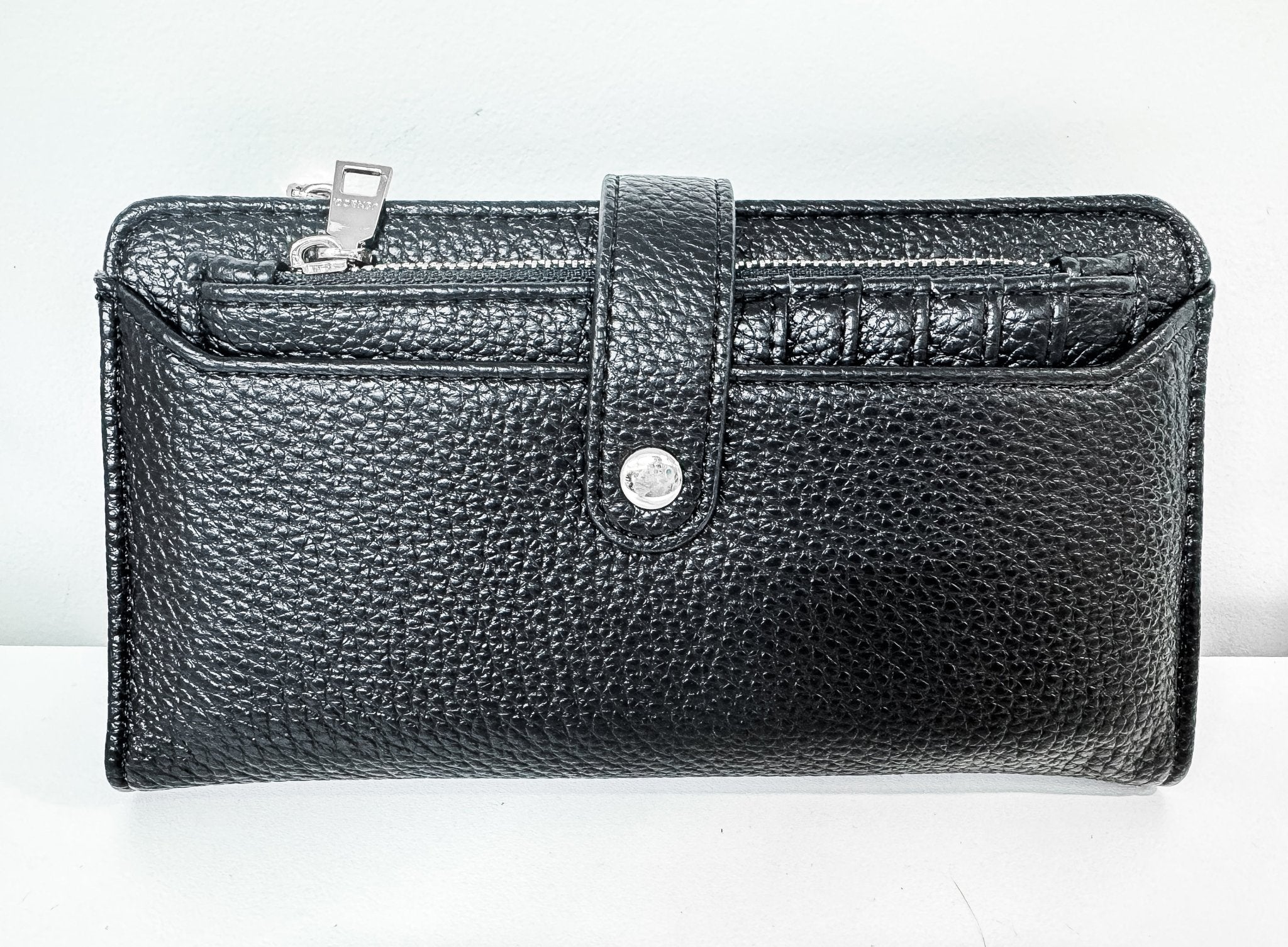 Fold out wallet with snap closure and top zip pocket. Front slip pocket with removable card slot wallet and zip pocket. Inner card slots and slip pockets.