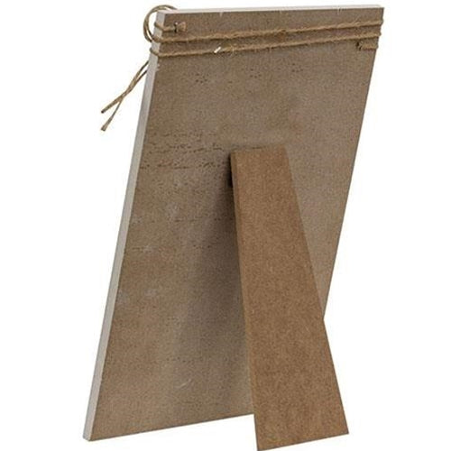 The top of the sign is decorated with a jute rope bow and a pressed metal leaf. The back of the sign has a wooden easel kickstand, perfect for propping this sign up on a tabletop or shelf during Fall.