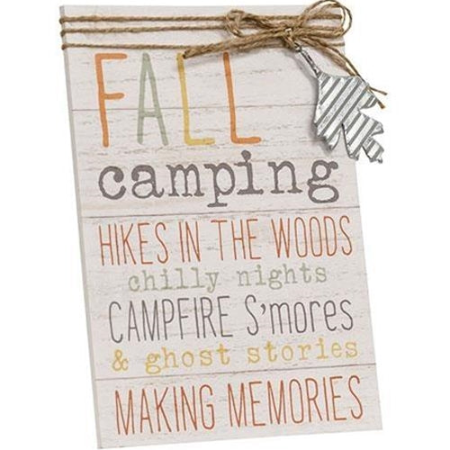 The sign reads “Fall”, “camping”, “hikes in the woods”, “chilly nights”, “campfire s’mores”, “ghost stories”, and “making memories”, all in an autumnal, multi-colored font.