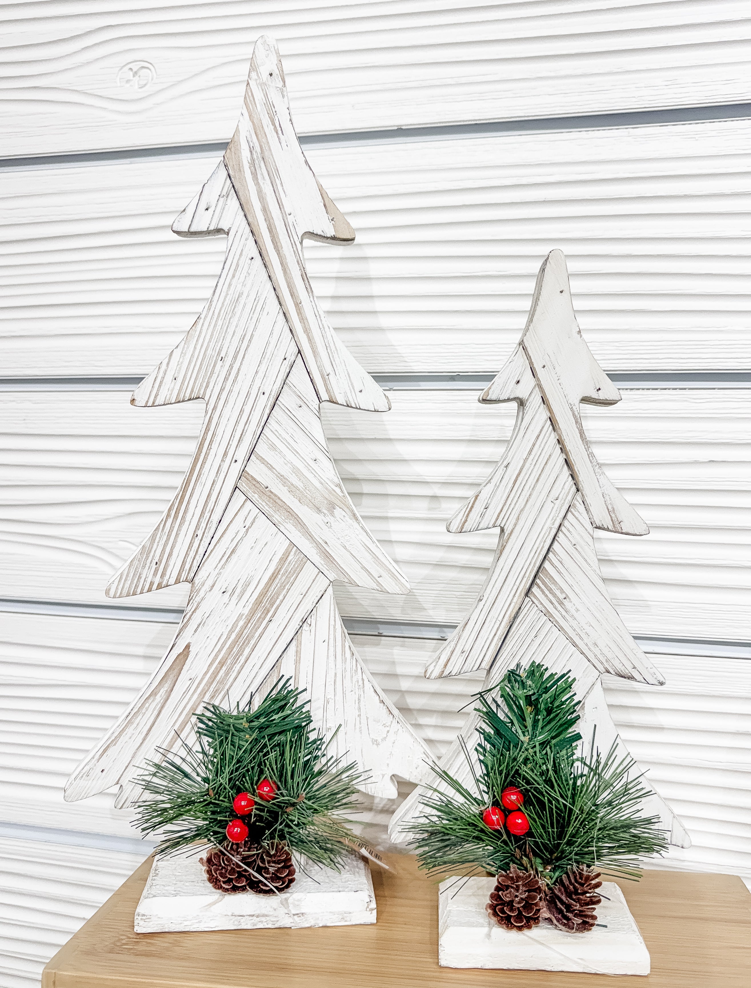 Bring a touch of winter magic to your space with these Frosted Timber Festive Wooden Trees. Standing proudly on their own, each tree is adorned with charming accents of pine, berries, and pinecones, all wrapped in a delightful, whitewashed finish. Perfect for brightening up any tabletop or shelf, they add a playful and cozy vibe to your holiday decor.