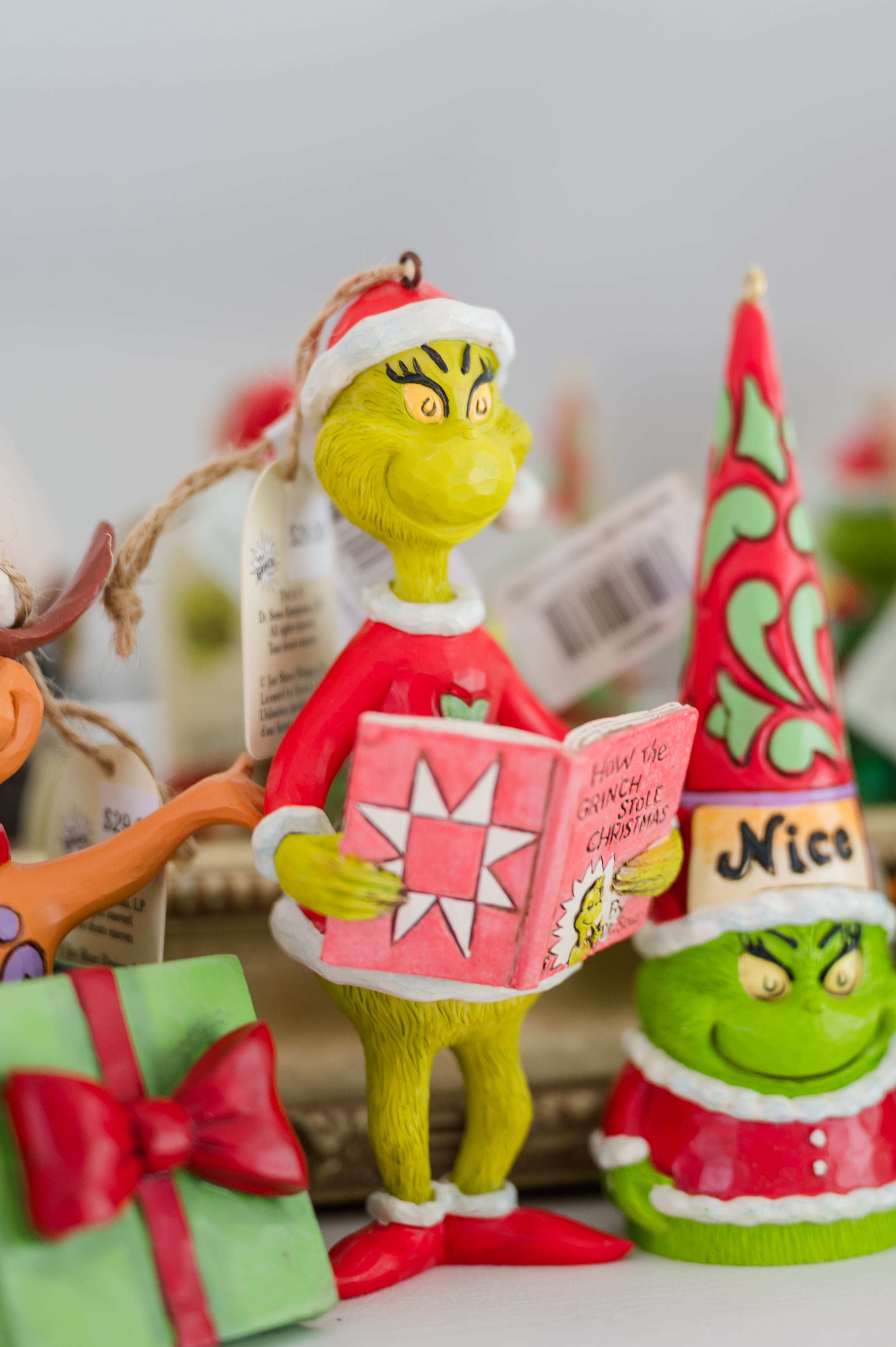 Grinch With Book: The Grinch wears a rosemaling adorned Santa suit as he studiously reads a copy of How the Grinch Stole Christmas by Dr. Seuss. This Jim Shore ornament captures this whimsical scene with charming detail, as the Grinch studies his own story!